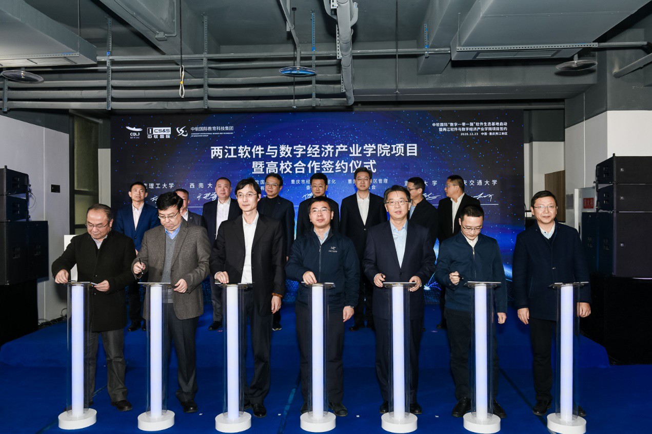 12月23日,中软国际“数字一带一路”软件生态基地启用暨两江软件与数字经济产业学院项目签约仪式在重庆两江新区举行。副校长王进军、国内合作处、产业技术研究院、计算机与信息科学学院 软件学院相关负责人出席签约仪式。