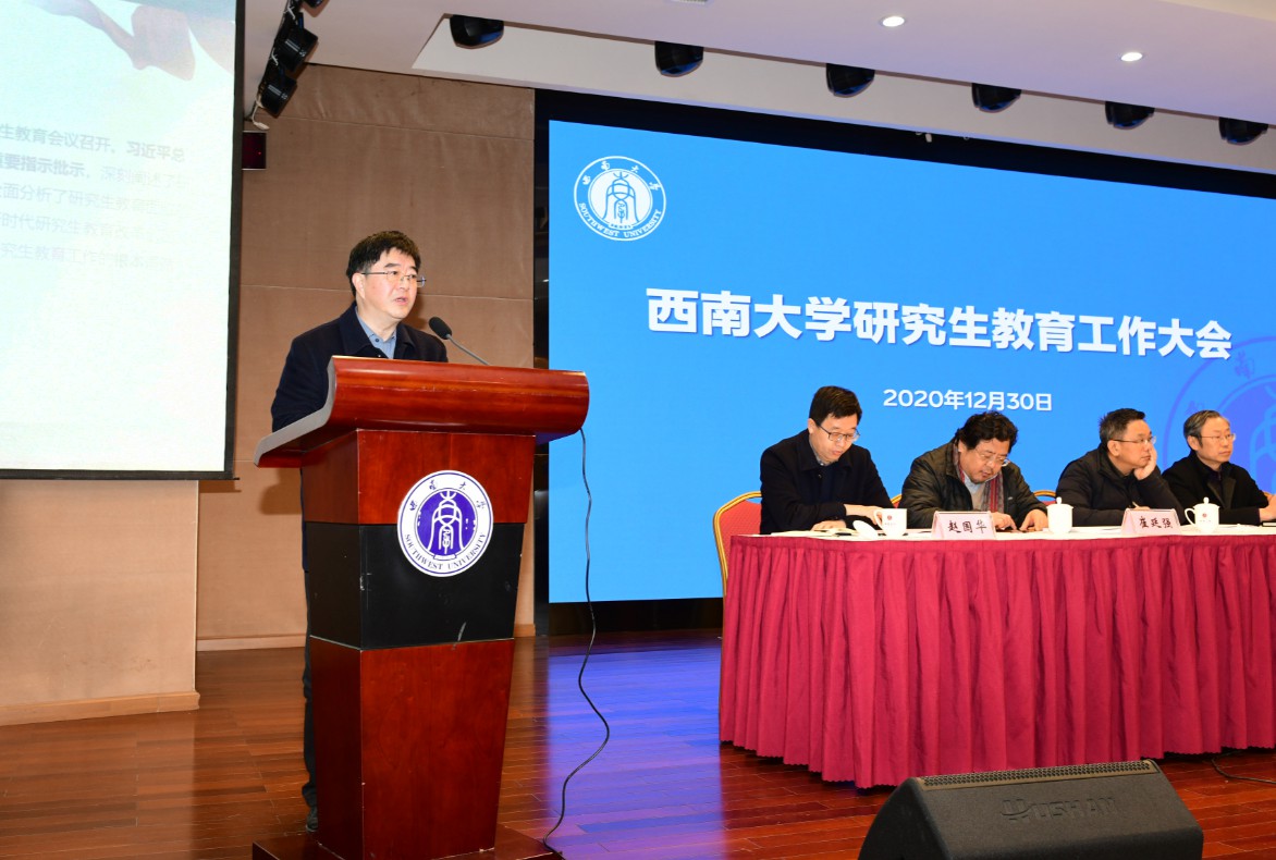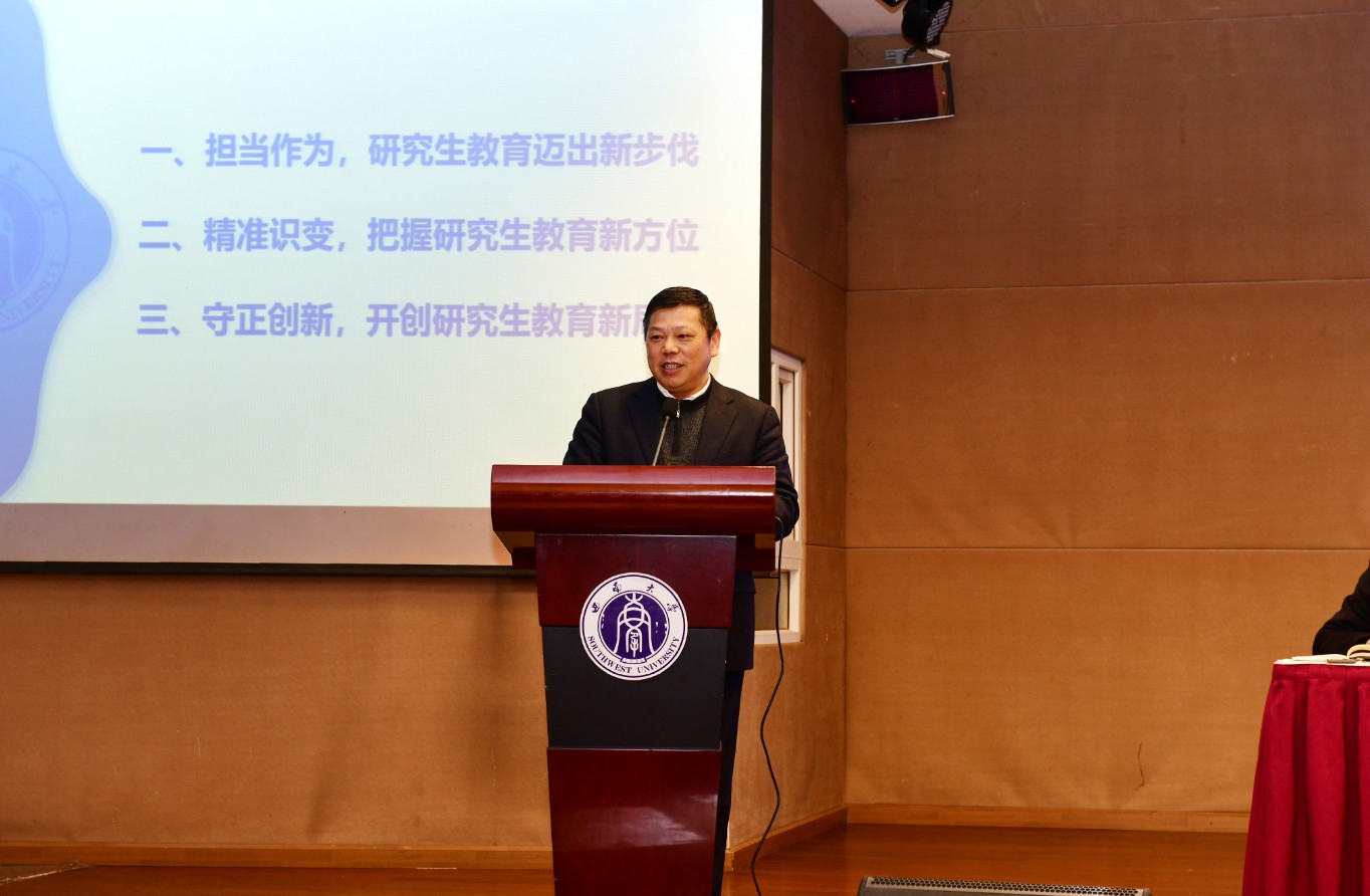 为贯彻落实习近平总书记对研究生教育的重要指示和全国研究生教育会议精神,全面把握国家“十四五”规划和2035远景目标要求,奋力开创学校研究生教育新局面。12月30日,学校召开研究生教育工作大会。学校党委书记李旭锋,校长张卫国,党委副书记安春元,党委副书记、纪委书记李华,副校长陈时见、崔延强、王进军、赵国华出席会议,学校相关单位负责人、研究生辅导员、教学秘书、导师代表和研究生代表参加会议。会议由副校长靳玉乐主持。