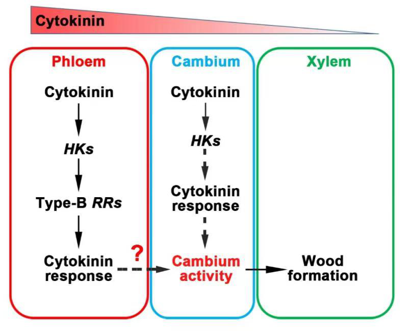 2月4日,植物学领域权威期刊New Phytologist(新植物学家)在线发表了罗克明教授团队题为“Cytokinin signaling localized in phloem non‐cell‐autonomously regulates cambial activity during secondary growth ofPopulusstems”(定位于韧皮部的细胞分裂素信号异位调控杨树次生生长过程中的维管形成层活性)的研究论文。该研究报道了在杨树维管形成层活性受到细胞分裂素信号的非细胞自主性调控,这一机制在树木维管形成层活性维持和木材形成过程中发挥关键作用。该研究发现,细胞分裂素是调控维管形成层干细胞的关键激素信号,但是其大量累积在韧皮部,而非维管形成层位置。特异性改变韧皮部位置的细胞分裂素信号强度能够显著调控维管形成层细胞活性进而影响木材产量。这一成果为木材合成和产量调控提供了新见解,更为开展林木新种质设计育种以提高木材产量提供了重要的分子靶点。
