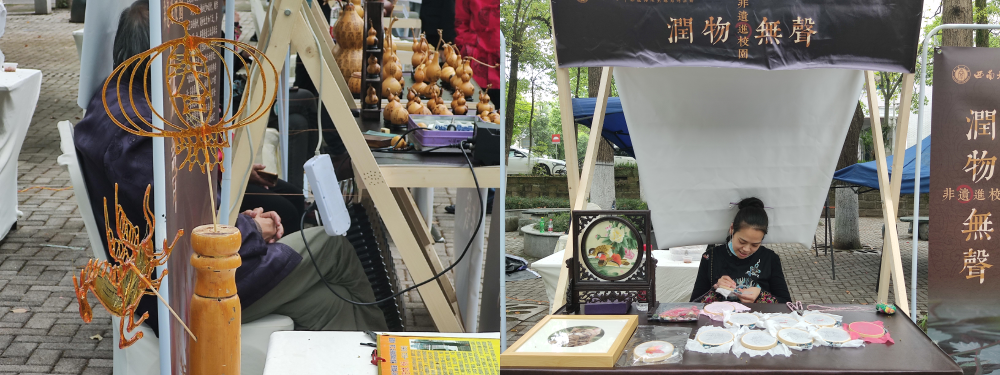 本次活动展出的荣昌陶器是中国四大名陶之一,起源于汉代,兼具观赏性和实用性,有“红如枣、薄如纸、声如磬、亮如镜”的美誉,学校和荣昌区共建的“beat365英国官网荣昌非物质文化遗产研究中心”在现场展示荣昌陶器的制作流程及其精美艺术品。夏布是荣昌著名的传统手工艺品,以独特的编织工艺被评为我国非物质文化遗产,作为教育部首批中华优秀传统文化传承基地的beat365英国官网“重庆荣昌夏布织造技艺传承基地”师生团队重点展示了夏布制作工艺及其精美艺术品。活动还邀请重庆市级非遗传承人进校园现场展示糖画、捏面人、葫芦烙画、蜀绣等传统技艺的制作过程,师生通过现场互动进行深入了解。