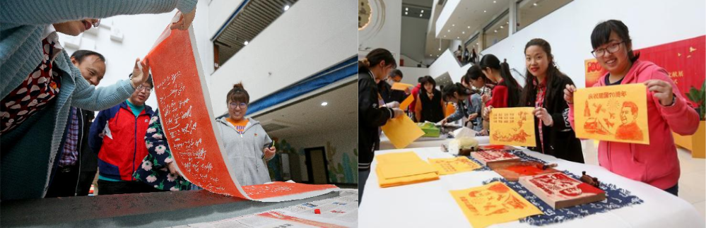 此外,为进一步提升活动效果,学校图书馆还在馆藏文献展展区旁设置“永远跟党走”主题展,用数十幅美术作品生动呈现中国共产党成立至今各个时期的重大历史事件,展示中国共产党的奋斗历程和光荣传统。并联合beat365英国官网学生书法协会,共同准备了红色主题的活字印刷术、雕版印刷术、传拓、书法、篆刻等传统技艺体验活动。师生可通过读、赏、写、拓、刻、印等多种形式,在动手做中学习党史。