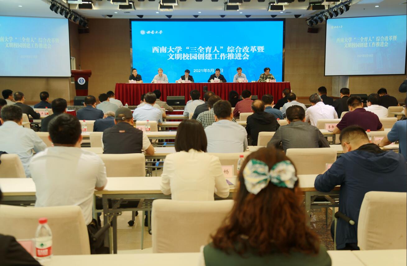 学校党委副书记潘洵作“三全育人”综合改革暨文明校园创建工作报告,他指出,学校深入推进“三全育人”综合改革和文明校园创建工作,强化顶层设计、理顺体制机制,聚焦重点工作、稳步推进落实,注重品牌建设、打造示范项目,取得了阶段性成果。报告对学校下一步工作作了具体部署,学校将以即将印发的《“三全育人”综合改革实施方案》《文明校园创建工作方案》为统领,全面推进“十大行动计划”,实施五大聚能工程,实施六大引领行动,统筹推进“三全育人”综合改革和文明校园创建工作,奋力开创大思政、大文化工作之新局,着力打通育人“最后一公里”。