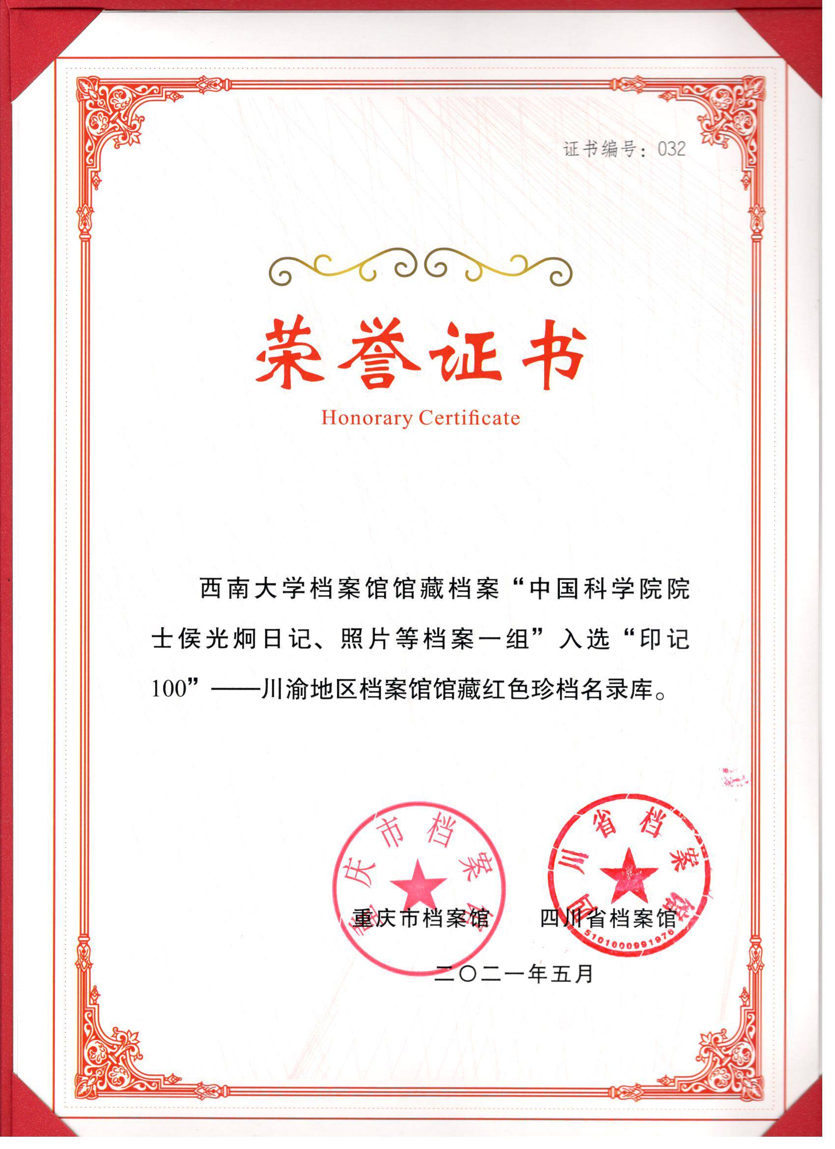 为庆祝中国共产党成立100周年,推动川渝地区档案工作一体化高质量发展,重庆市档案馆、四川省档案馆于今年1月联合启动“印记100”——川渝地区档案馆档案宣传系列活动。近日,两地共同在成都召开“印记100”——川渝地区档案馆馆藏红色珍档发布会,正式向社会公布首批100件(组)川渝地区档案馆馆藏红色珍档名录,并举行品读活动。学校档案馆馆藏的“中国科学院院士侯光炯日记、照片等档案一组”入选。