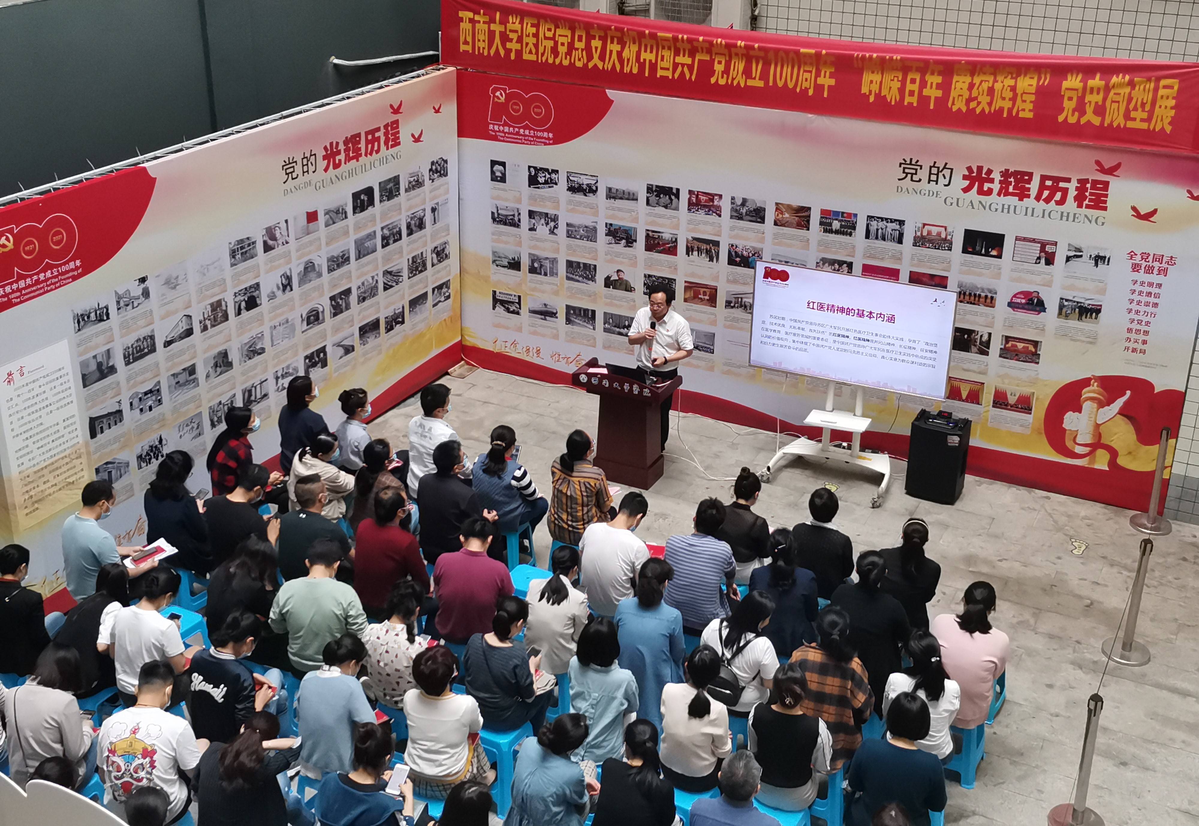 医院党总支结合医疗工作深学党史。通过党史展、专题党课,带领党员同志“重回”历史现场,领会“红医精神”,引导全体党员将学习党史与总结经验、关照现实、推动工作结合起来,更好地为师生群众服务。