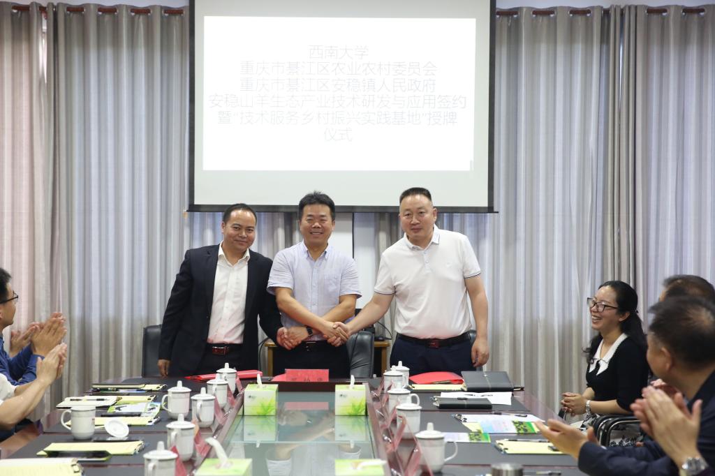 5月29日,动物科学技术学院与綦江区安稳镇在安稳镇人民政府五楼会议室举行“安稳山羊生态产业技术研发与应用”签约暨“技术服务乡村振兴实践基地”授牌仪式。出席仪式的有綦江区副区长蒲德洪,区委组织部、区农业农村委、区文化旅游委相关领导,学院党政领导班子、归国教师代表、安稳镇相关领导和工作人员。仪式由安稳镇党委副书记、镇长王宗恒主持。