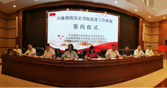参观调研结束后,三校全体党员参加了川渝高校历史学院党建工作联盟签约仪式。此次三校联盟签约,有助于历史学者组成的党支部发挥学科优势、专业优势和人才优势,通过联盟推动川渝地区高校党建工作更上一层楼,三校历史学院党支部将会抓住契机,在今后进一步加强交流、互通党建工作经验,推动党建与事业的融合发展,在成渝双城经济圈建设和民族复兴大任中建功立业。