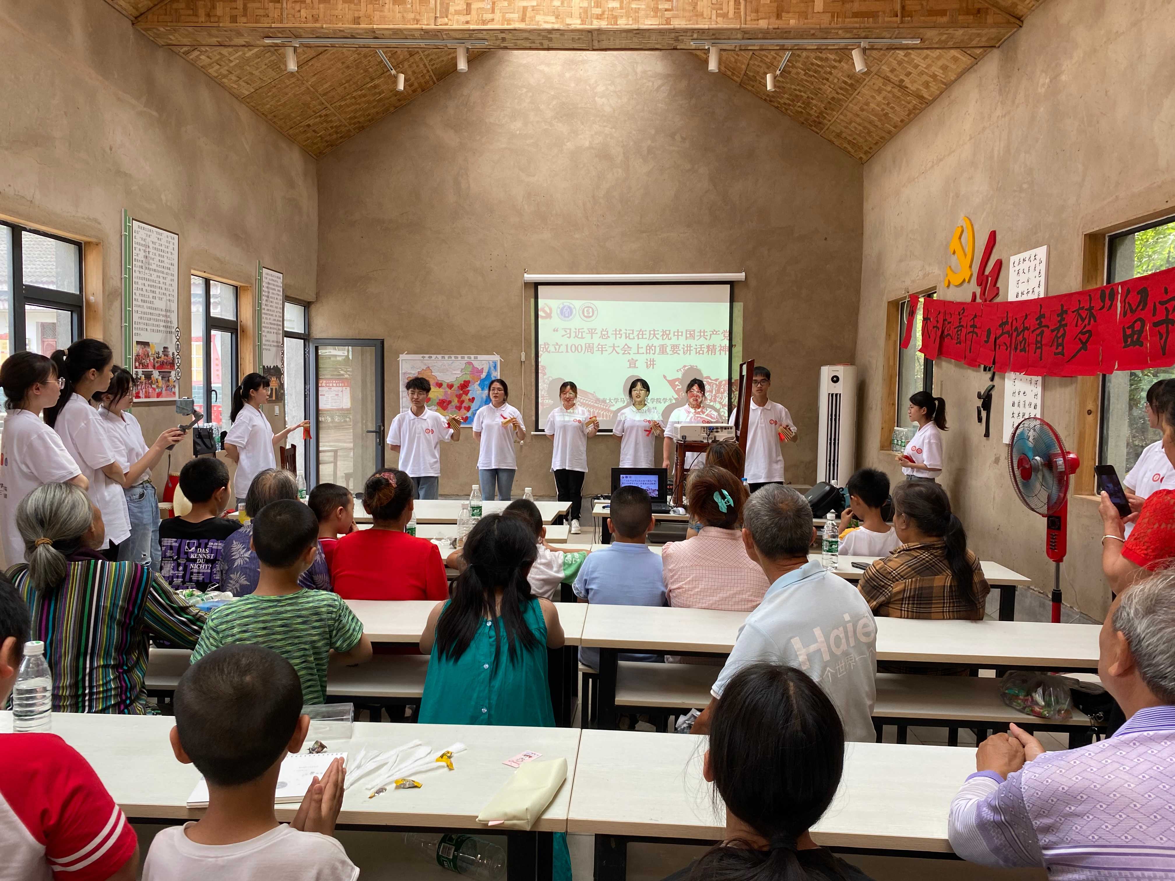 为深入学习贯彻习近平总书记“七一”重要讲话精神,beat365英国官网大学生中国特色社会主义理论体系宣讲团(简称“学生宣讲团”)迅速行动,精心组织,深入农村,围绕习近平总书记在庆祝建党100周年大会上重要讲话精神,开展形式多样的宣讲活动,用大学生特有的方式,让宣讲有滋有味,让“七一”重要讲话精神深入人心。
