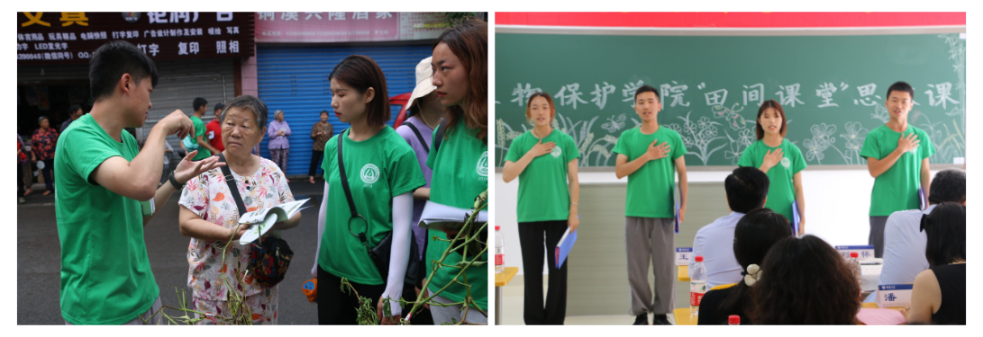 心系三农,“科技赶场”。赶场这天,镇上人流较多的农贸市场口摆放着植物病虫害标本、易拉宝、宣传手册,路过的村民总是忍不住好奇瞧瞧。“爷爷你看啊,这种虫相信您见过,也知道它多么‘厉害’,怎么除掉它,不再让它危害我们的农作物呢?我们这里提供了些办法……”身着绿色短袖的志愿者正向村民进行知识科普。此外,志愿者对当地农户家庭基本田地情况、种植情况,绿色防控、生态调控以及化学农药的了解程度等进行调研。