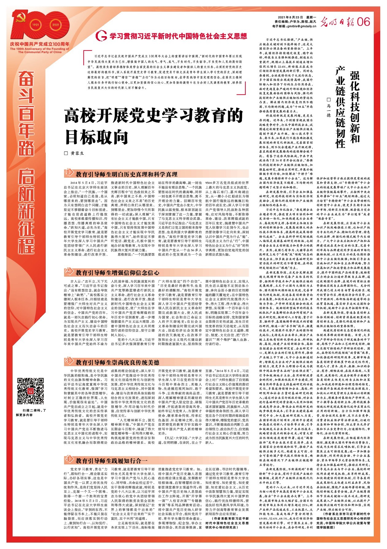 8月23日,光明日报06版《奋斗百年路 启航新征程》刊发教育部习近平新时代中国特色社会主义思想研究中心特约研究员、学校马克思主义学院黄蓉生教授的理论文章《高校开展党史学习教育的目标取向》,全文如下: