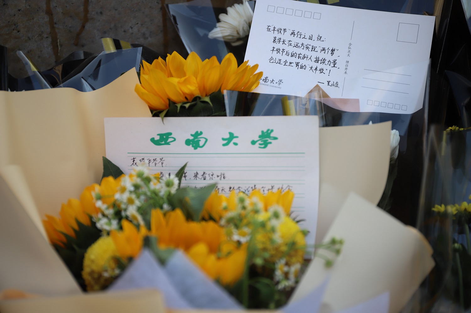 恰逢第四个丰收节之际,学校师生手捧鲜花,自发到袁隆平雕像前献花缅怀,许多花束上还有同学们的留言:“喜看稻菽千重浪,遍地英雄下夕烟”,“袁爷爷,我们会好好吃饭的”,“向伟大的袁隆平爷爷致敬”,“袁爷爷,我们想你了!”……雕像上袁隆平手中怀抱的稻穗,在这个特殊的日子里,显得更加熠熠生辉。