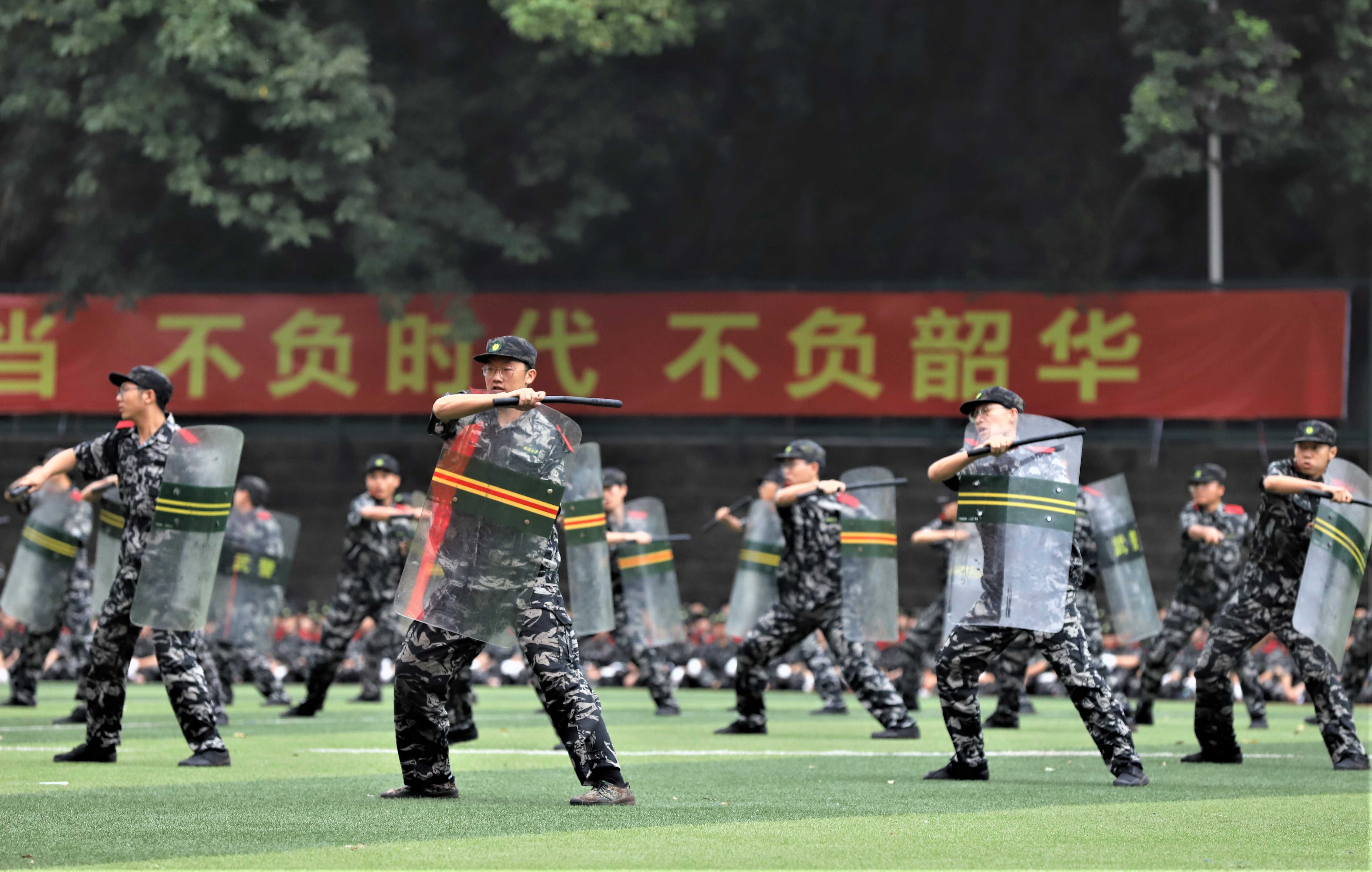 据悉,学校2021级本科生军训从2021年9月13日起,通过分散军训和集中军训两个阶段,按照全员参与、阶段推进、学练结合、基础实用的原则有序组织开展。集中军训阶段,10000余名参训学员全员参与、刻苦训练,认真开展队列动作、分列式、特种战术、心理健康操等科目训练,并认真开展国防教育、人民防空教育、部队光荣传统教育等科目的线上学习活动。在全学年内,学校还将陆续开展内务卫生整理、早操出勤训练、消防技能训练、自救互救训练、考核比武等学习实践活动。帮助新生培养良好学习生活习惯,掌握各项应急技能。