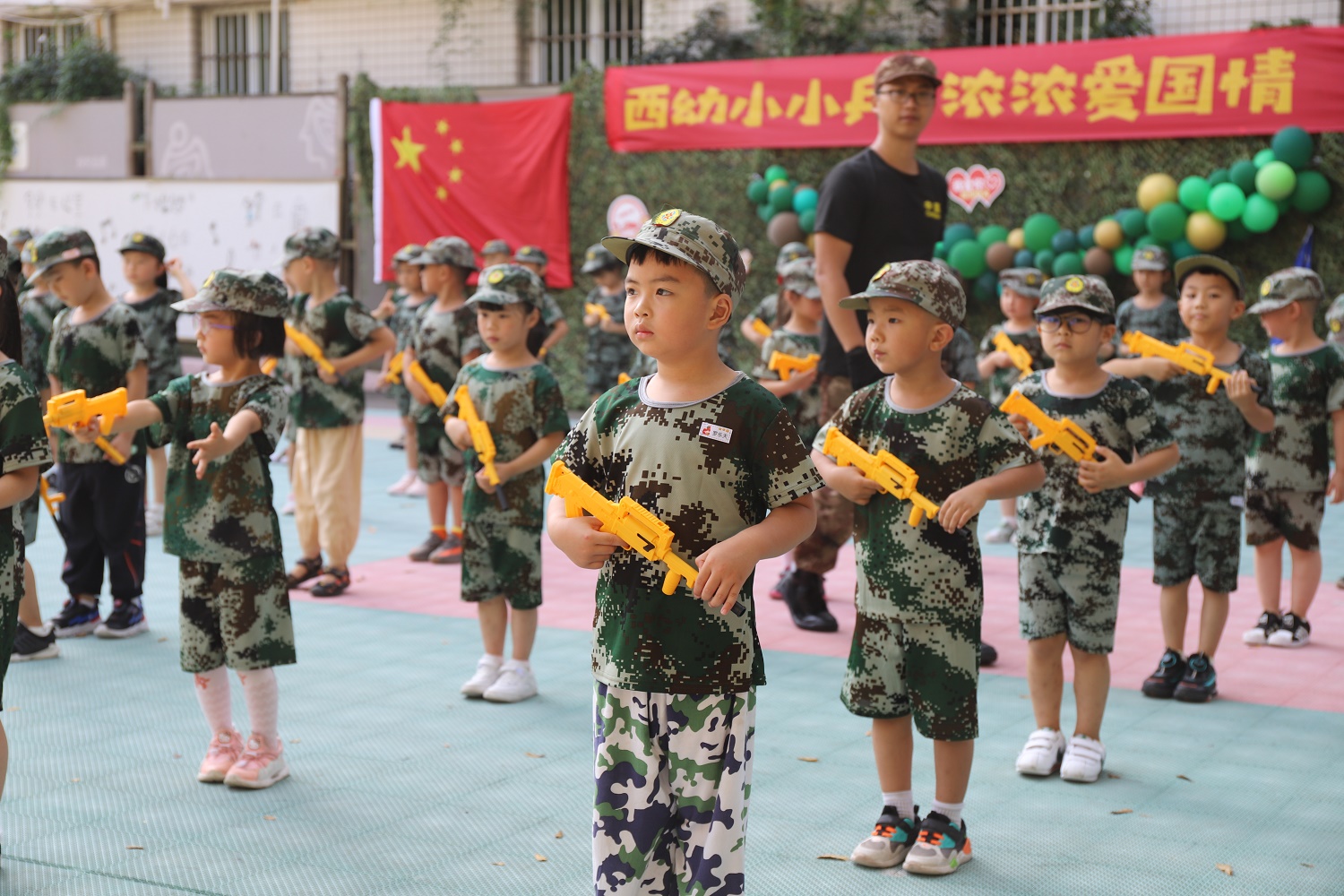 9月30日上午,实验幼儿园举行“西幼小小兵 浓浓爱国情”国庆庆祝活动结训仪式,南北区的孩子们身着迷彩服,迈着整齐的步伐走上运动场进行汇报展示。