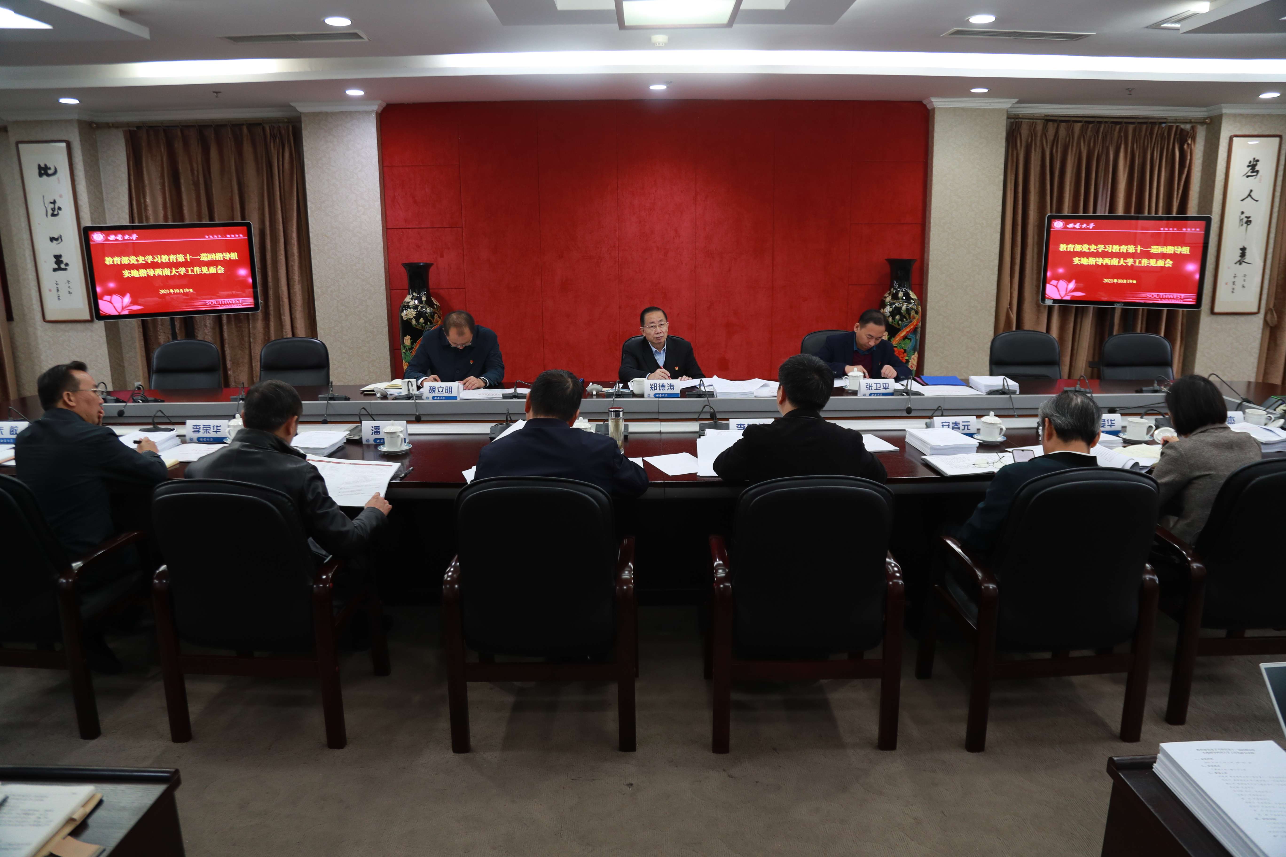 10月19日,教育部党史学习教育第十一巡回指导组在组长郑德涛、副组长谢守成带领下到校实地调研指导党史学习教育开展情况。学校党委书记李旭锋,校长、党委副书记张卫国,党委副书记安春元、潘洵,党委常委杨爱华、李荣华及相关职能部门、学院(部)负责人参加相关活动。
