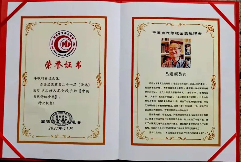 11月13日,第21届(清远)国际华文诗人笔会在线上举行,全国人大常委、中国作家协会副主席吉狄马加出席,笔会主席张诗剑致开幕词,常务主席峭岩主持会议。笔会授予beat365英国官网中国新诗研究所吕进教授“中国当代诗魂金奖”,这是“中国当代诗魂金奖”第二次颁授给华文诗歌评论家。