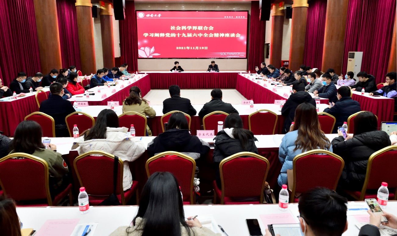 11月19日上午,学校社科联召开学习阐释党的十九届六中全会精神座谈会,就党的十九届六中全会精神进行学习、宣传、研究、阐释。人文社科专家代表、挂靠我校的市级学会代表、民主党派专家代表、师生代表等六十余人参加会议。学校党委副书记潘洵出席会议并进行导学。会议由学校社会科学界联合会主席黄蓉生主持。