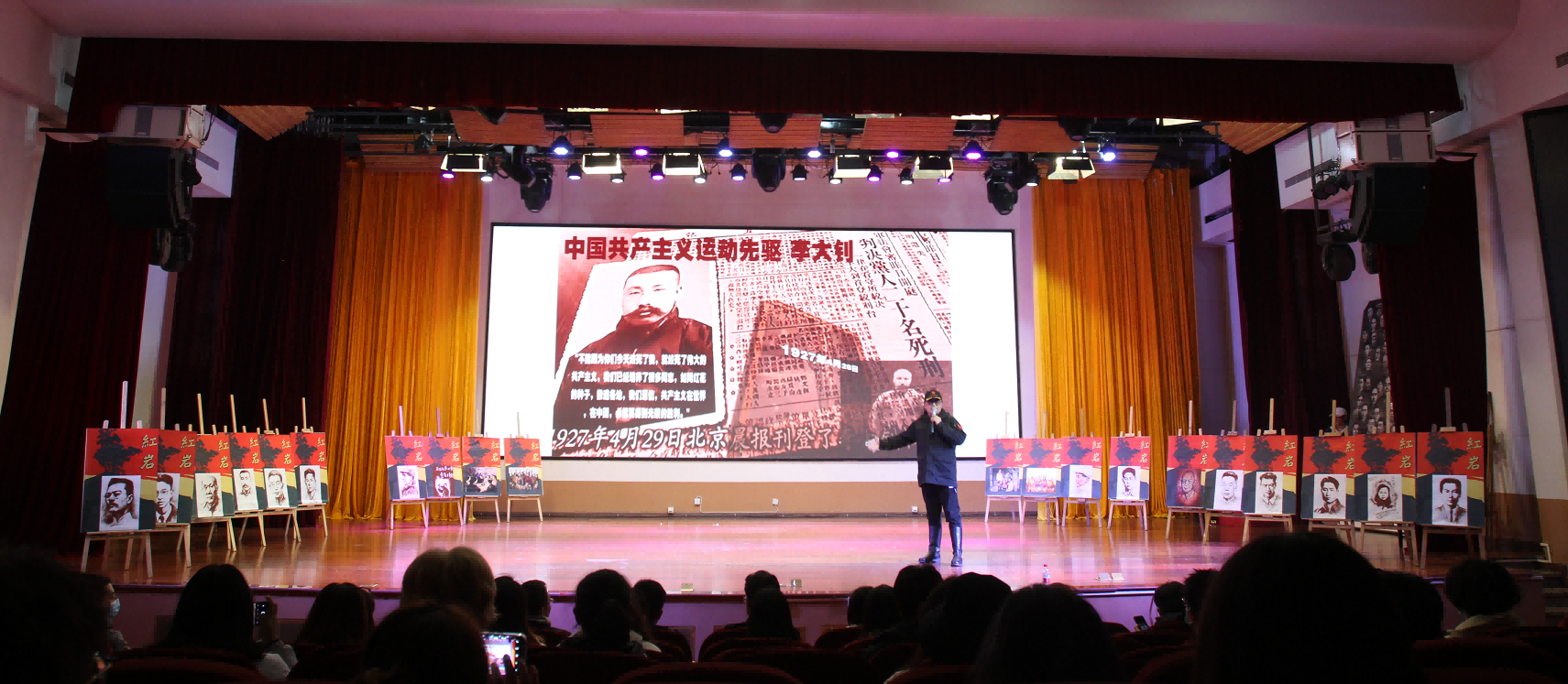 主讲人美术学院刘增宪老师讲述美院学子创作英烈画像的故事,并现场展示新生们创作的高达2米的巨幅画作《共和国之魂》。这幅画作描绘了70多位为新中国的建立、建设发展作出卓越贡献的英雄模范。英雄们光辉的形象跃然纸上,象征着新中国的精神命脉。