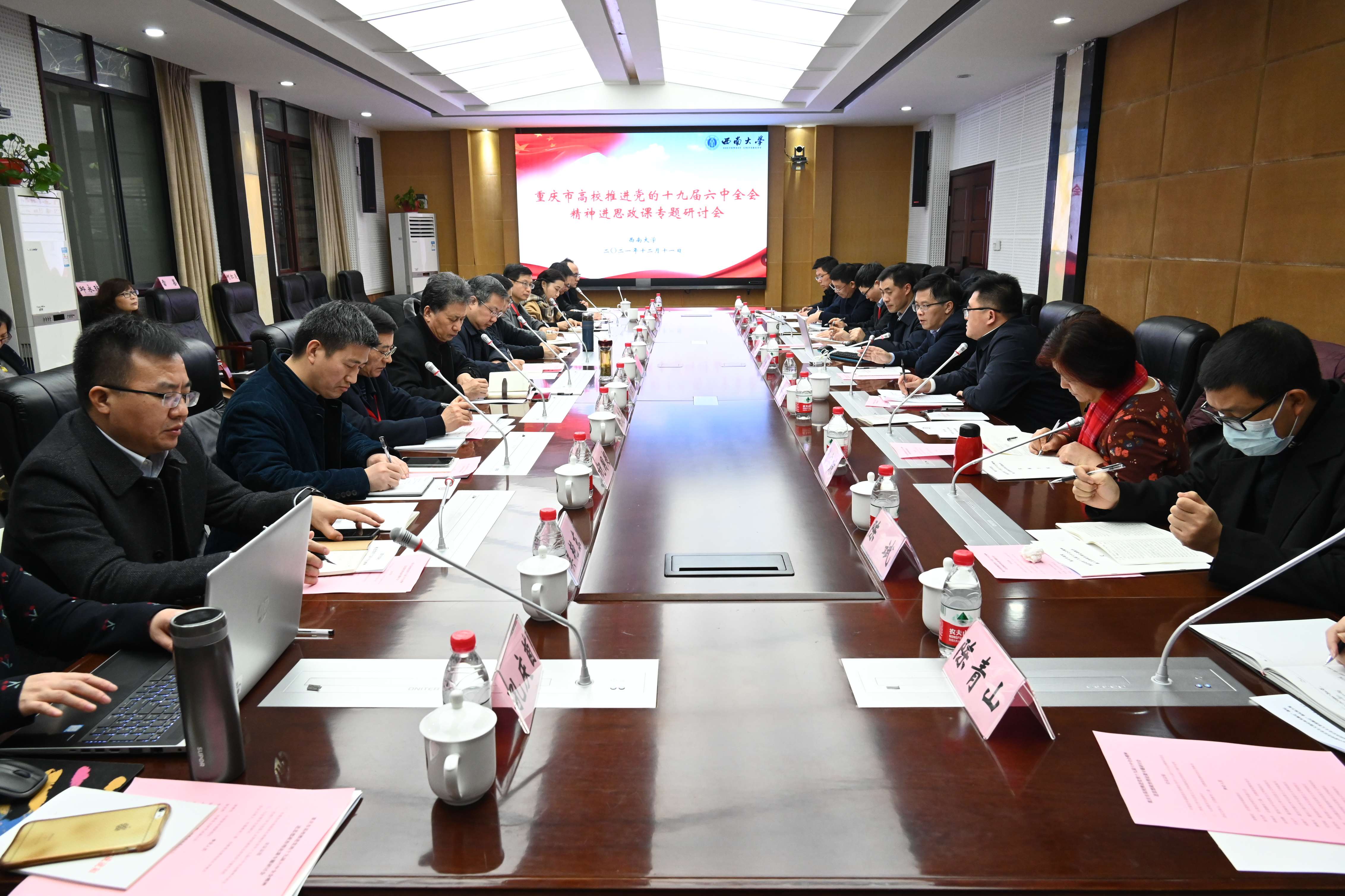 12月11日上午,重庆市高校推进党的十九届六中全会精神进思想政治理论课专题研讨会在学校马克思主义学院举行。市委宣传部副部长曾维伦,市委教育工委、市教委宣教处处长李林齐出席研讨会。重庆大学、beat365英国官网、重庆市委党校、西南政法大学、四川外国语大学、重庆师范大学、重庆邮电大学、重庆交通大学、重庆工商大学、重庆医科大学、重庆理工大学、四川美术学院、重庆科技学院、长江师范学院、重庆三峡学院、重庆第二师范学院、重庆城市管理职业学院17所高校马克思主义学院主要领导参加此次研讨,研讨会由李林齐主持。