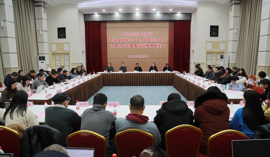 12月23日下午,学校在桂园宾馆金桂厅召开学习习近平总书记在中国文联十一大、中国作协十大开幕式上的重要讲话精神座谈会。党委副书记潘洵出席座谈会,中国文联十一大代表段运冬教授、中国作协十大代表蒋登科教授,相关职能部门负责人,相关教学单位党政主要负责人和教师代表参会。党委常委、党委宣传部部长李荣华主持会议。