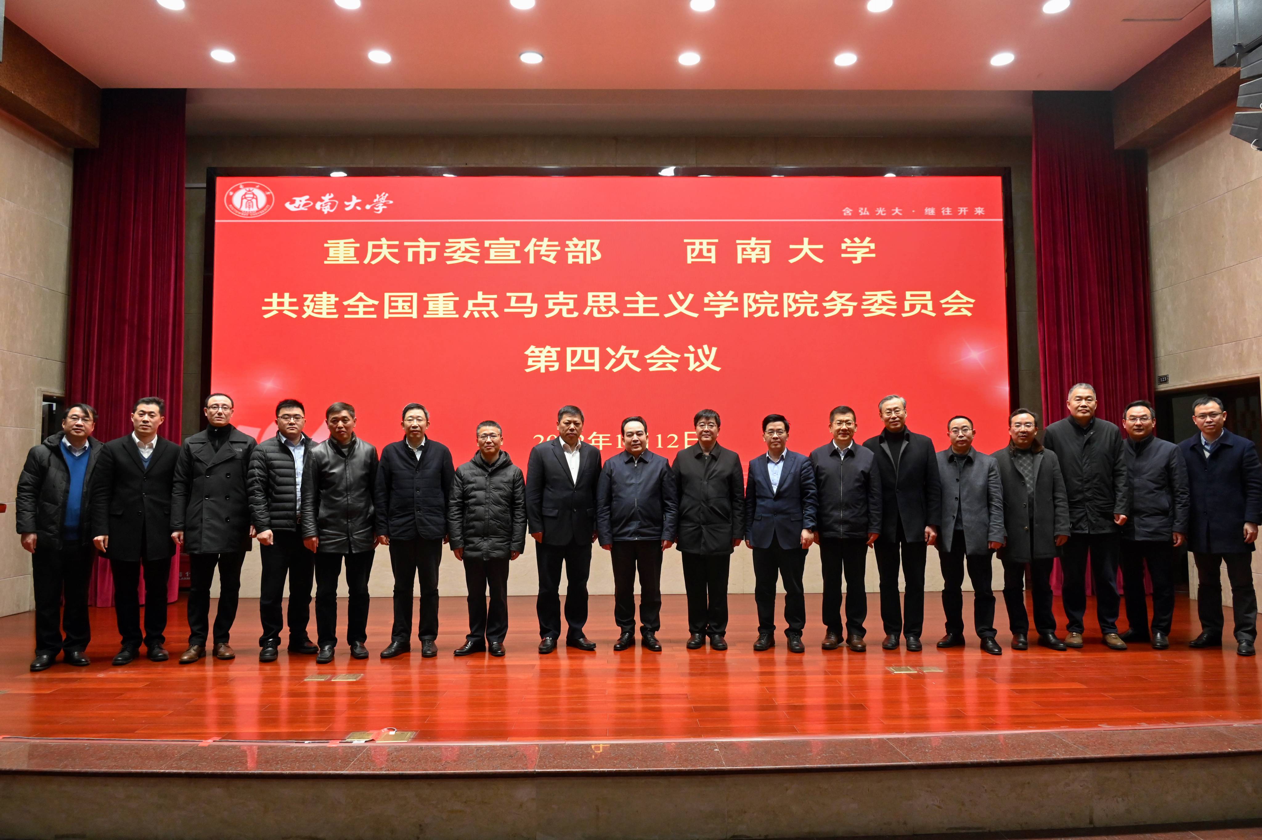 1月12日上午,重庆市委宣传部、beat365英国官网共建全国重点马克思主义学院院务委员会第四次会议在beat365英国官网召开。重庆市委常委、宣传部部长张鸣,重庆市委宣传部副部长、一级巡视员曾维伦,重庆社科院党组书记、院长刘嗣方,重庆社科联党组书记、副主席李保海,重庆市委教育工委专职副书记覃正杰,学校党委书记李旭锋、校长张卫国、党委副书记安春元、党委副书记潘洵出席会议。重庆市委宣传部理论处,重庆市委教育工委宣教处及beat365英国官网相关职能部门负责人、马克思主义学院党政负责人参加会议。会议由李旭锋主持。