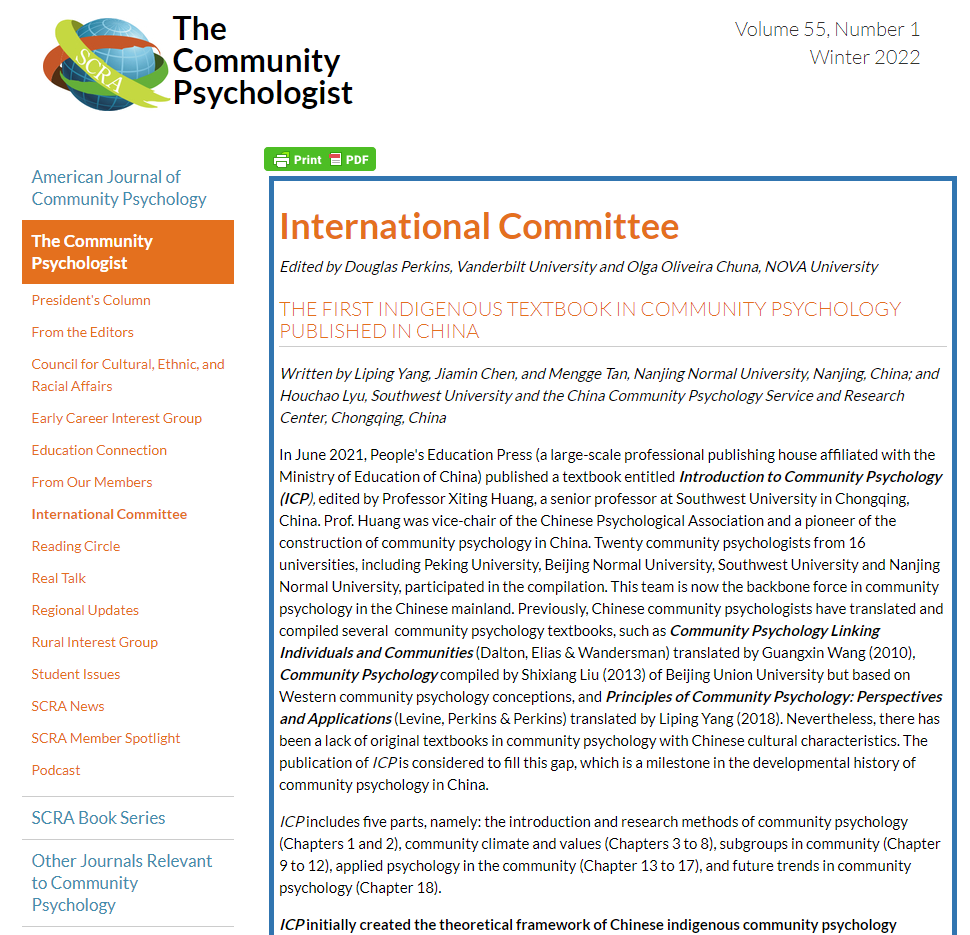 2022年1月,美国心理学会(APA)社区研究与行动分会的官方期刊《The Community Psychologist》刊发了南京师范大学杨莉萍教授团队和学校心理学部吕厚超教授的文章“中国首次出版本土社区心理学教材”(“The First Indigenous Textbook in Community Psychology Published in China”)。本文为国际社会观察和了解中国社区心理学现阶段发展提供了一个窗口。