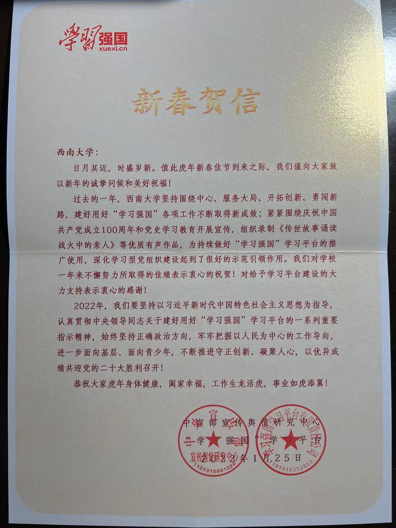 1月25日,中宣部宣传舆情研究中心、“学习强国”学习平台向学校发来贺信,贺信全文如下: