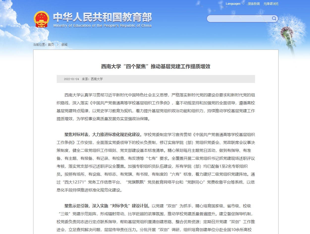 近日,学校党委“四个聚焦”推动基层党建工作提质增效,受到教育部一线采风栏目的报道,相关内容由党委组织部、党政办公室报送。教育部网站报道原文如下: