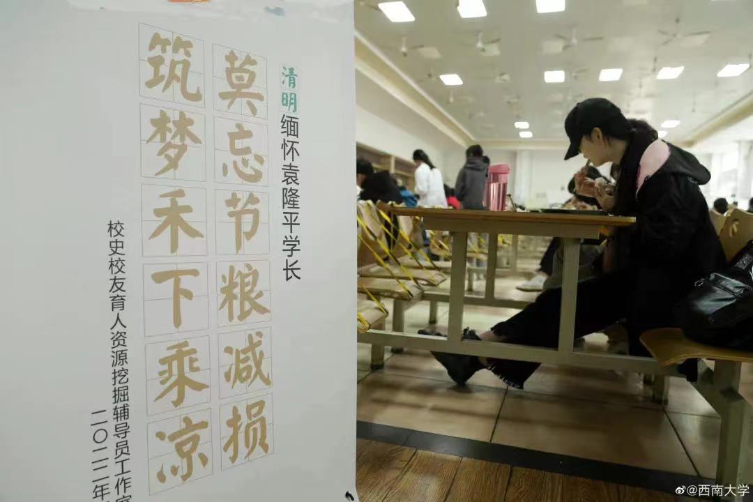 在清明节即将到来之际,学校学子还发起名为“丰年不忘饥苦,富岁当思节约”的“光盘行动”,以此寄托对袁隆平院士的怀念,表达从自我做起的信念。近年来,学校通过成立专门的辅导员工作室,对校史校友的资源进行挖掘,通过发动辅导员和专业教师形成校史校友资源育人的合力,引导学生形成奋发向上的正能量。