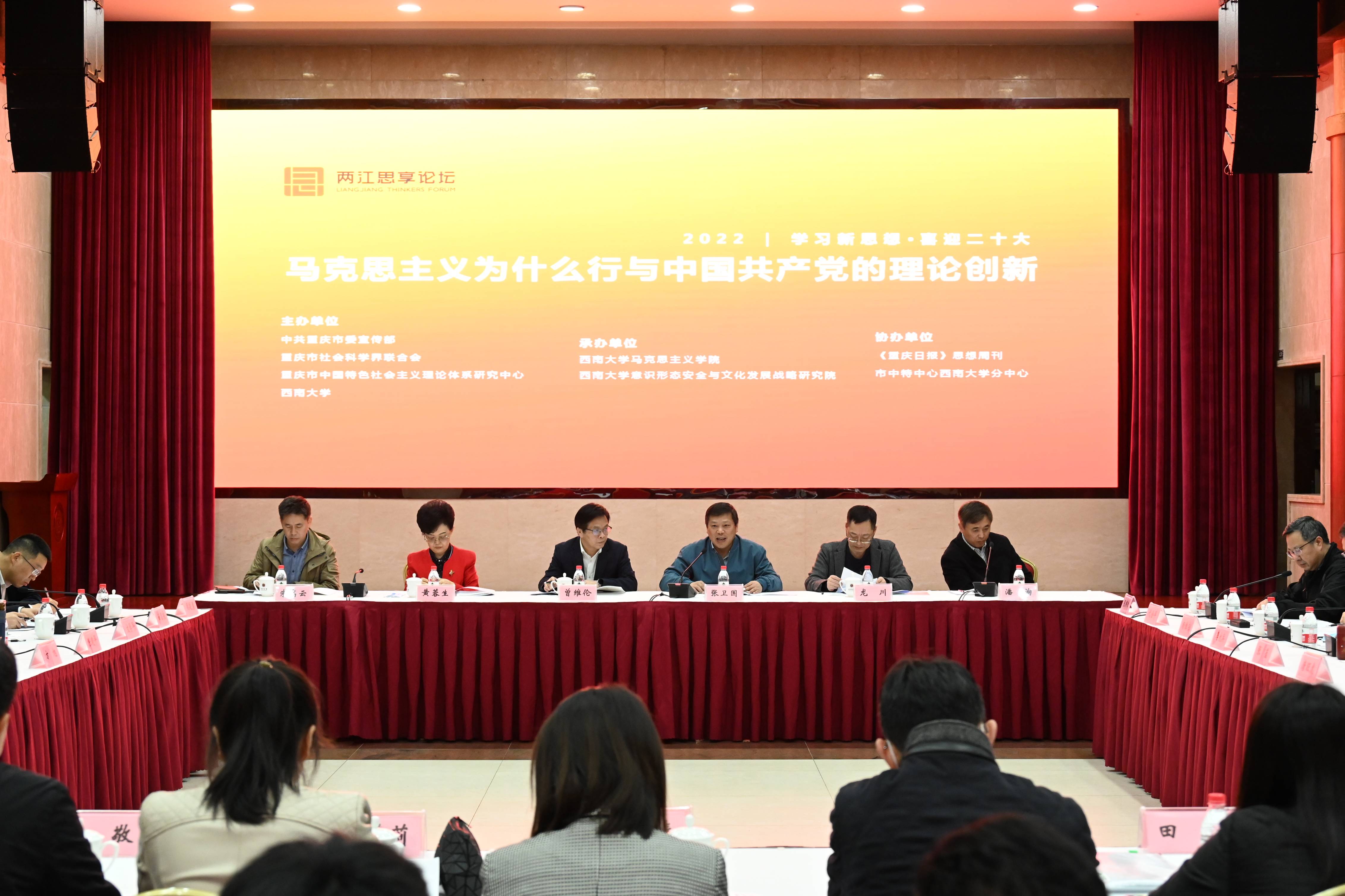 2022年4月16日,在习近平总书记视察重庆提出“能”“行”“好”重大理论命题三周年之际,为深入贯彻落实党的十九届六中全会精神,推进习近平新时代中国特色社会主义思想研究,由中共重庆市委宣传部、重庆市社会科学界联合会、重庆市中国特色社会主义理论体系研究中心、beat365英国官网主办,beat365英国官网马克思主义学院、beat365英国官网意识形态安全与文化发展战略研究院承办的“两江思享论坛:学习新思想 喜迎二十大”首场会议“马克思主义为什么行与中国共产党的理论创新”学术研讨会在beat365英国官网召开。中央“马工程”首席专家、国务院学位委员会马克思主义理论学科评议组专家、重庆市社会科学界专家学者、《重庆日报》思想周刊负责人、媒体记者以及beat365英国官网师生代表参加研讨会。
