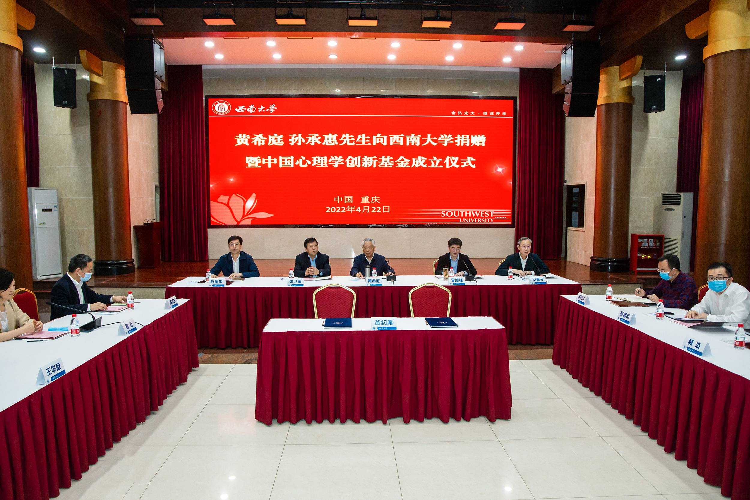 仪式上,李旭锋代表学校与黄希庭签订捐赠协议,赵国华接受捐赠支票,张卫国向黄希庭教授颁发捐赠铭牌及证书。