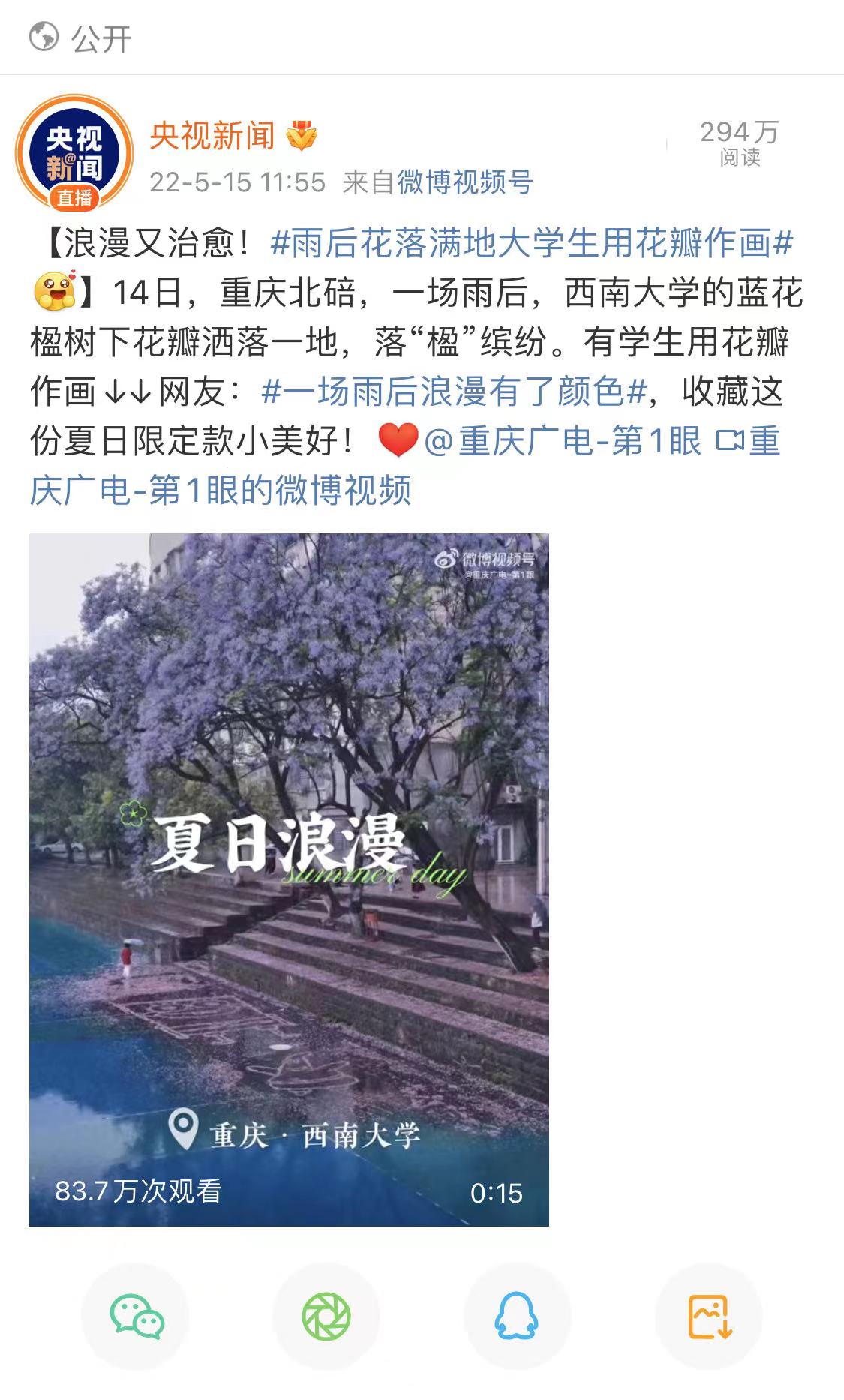 近日,有学生用飘落的花瓣作画,堆出“海绵宝宝”“派大星”等可爱造型,这份“初夏限定浪漫”引来了不少师生围观,成为一道亮丽的校园风景线。这一浪漫举动受到了媒体广泛关注,新华社客户端和官方微博、央视新闻官方微博、新华网等相继报道。