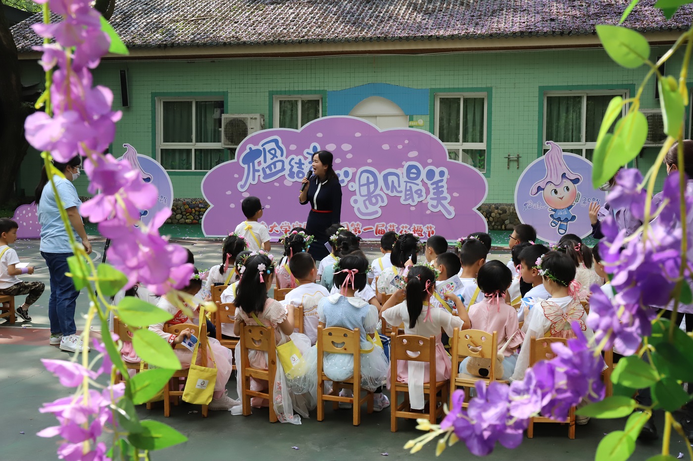 正值学校实验幼儿园中12棵蓝花楹盛开之际,幼儿园举办第一届“蓝花楹节”。取蓝花楹“毕业树”之意,在大班孩子们的毕业季举行本次活动,旨在按照幼儿园课程计划切实做好幼小衔接工作,并紧扣学校劳动周契机,以劳动教育为核心,在幼儿园开展劳动教育第一课。