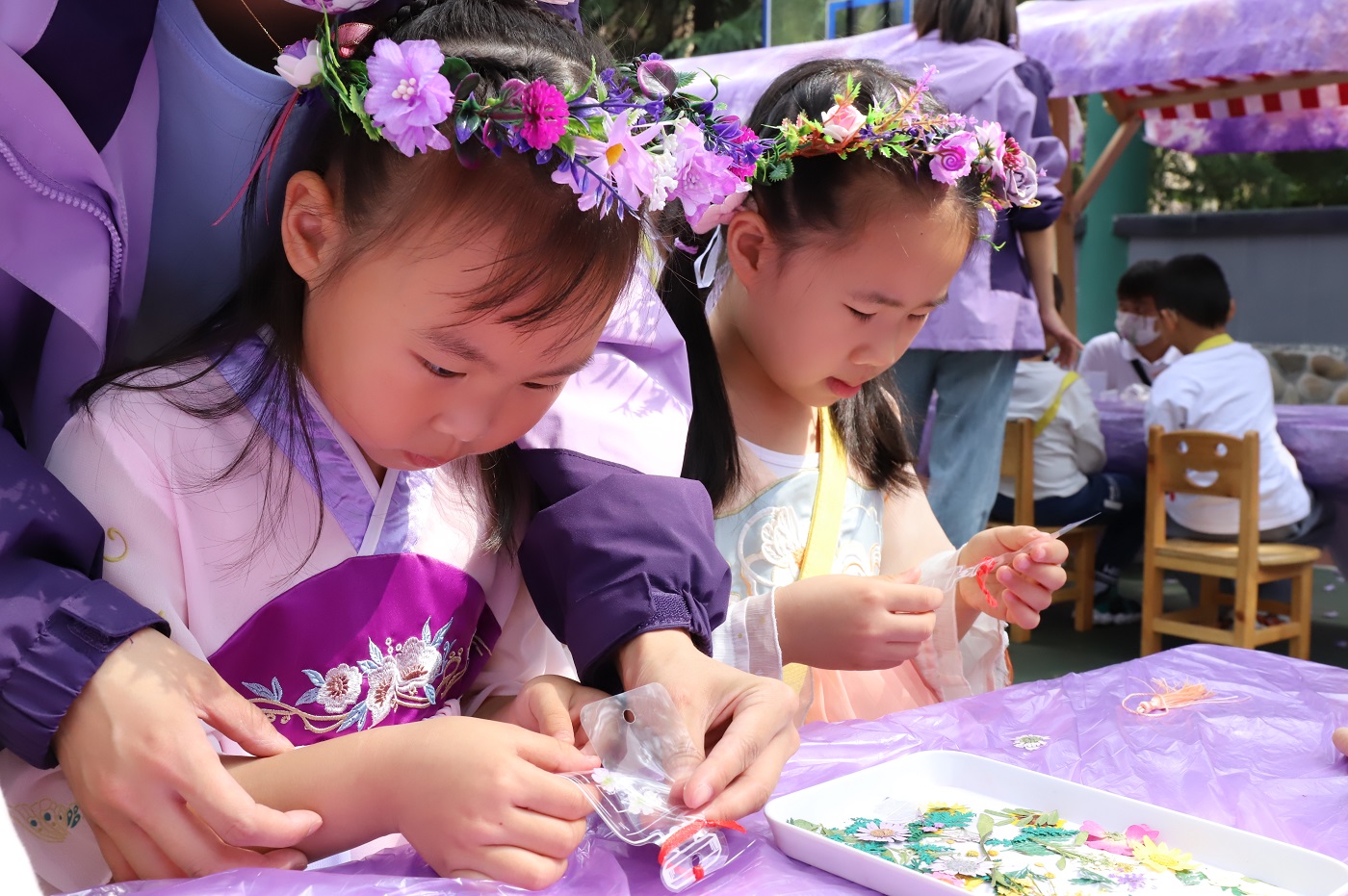 在本次蓝花楹节中,孩子们参与了拾捡落花制作花肥、运用花瓣花枝创意美劳等活动。幼儿园通过课程实施与蓝花楹活动的举办,培养孩子们的基本劳动技能,让他们学会照顾自己、照顾他人,在劳动中活动身体、发育心智、磨练耐性、创造美好。