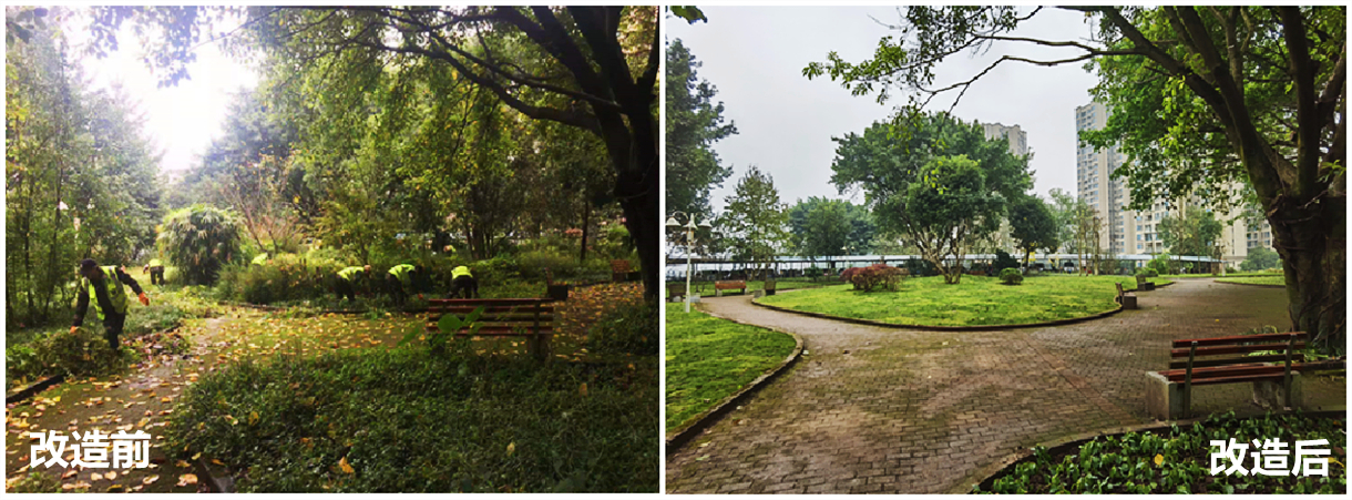 简化布局层次,打造日常景点。对校园主干道、社区广场及周边环境进行高压冲洗,彻底清除苔藓和顽垢,提升洁净度;对遮光枝叶进行修剪,对种植过密的树木进行移栽,提高可见度;对教学楼中庭花园、特色景点、休闲广场进行补植、清理,提高美观度。