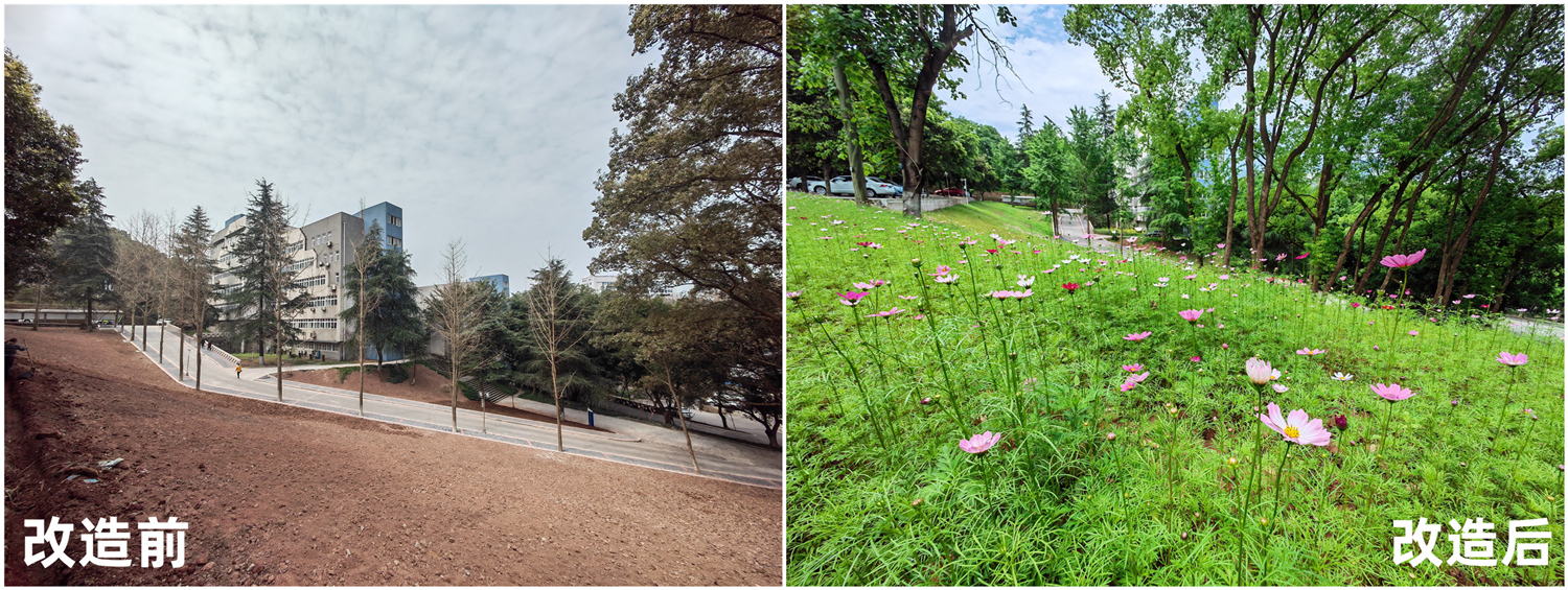 美化特色区域,打造打卡景点。除翻新宓园、孔园等已有景观,因地制宜、结合时令打造新景点。寒假中,教工食堂至荟文楼路段一旁的斜坡、橘园观光车停车站边的边坡、竹园后山的公路旁,经清理后都撒上了格桑花花籽,四五月里长成了迷人的花海,惹得路过的师生纷纷驻足观赏,拍照留念。