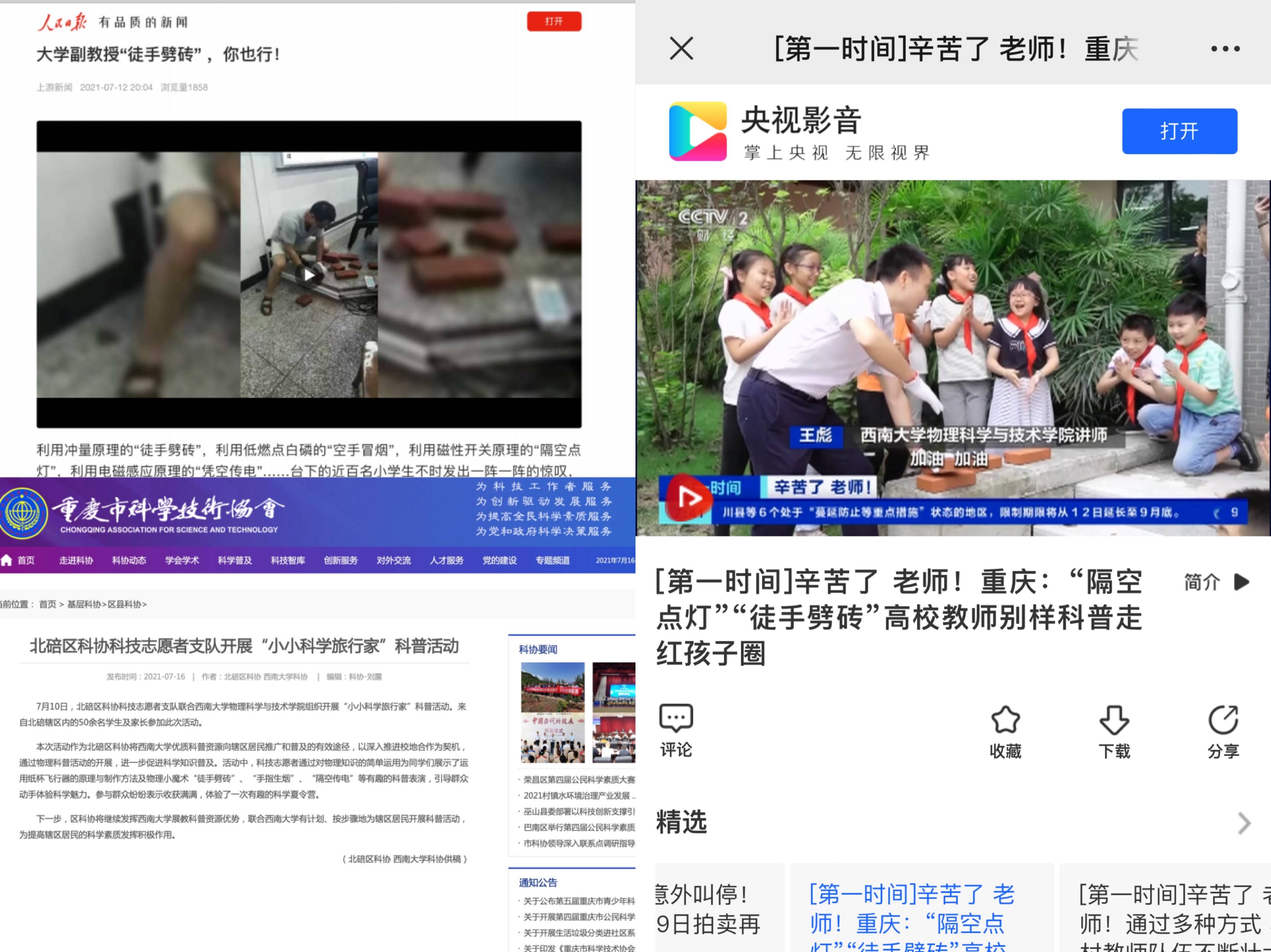重庆市科普基地主要是面向市内从事科普活动组织、科学和技术知识传播、科普创作、科普培训、科普展教品研发等工作的机构或组织,共分为场馆类、旅游景区类、教育培训类、传媒类、研发创作类共5类科普基地。经过多年的发展,“beat365英国官网科普空间站”已形成科普资源丰富、科普人员合理、科普形式多样的科普基地,具有鲜明的特色和优势,科普成绩优异,先后受到人民日报、央视、重庆卫视等多家权威媒体及重庆市科协、北碚区委宣传部等多家单位的广泛报道。“beat365英国官网科普空间站”重庆市科普基地将在物理科学与技术学院的统筹领导下继续努力,致力于线上线下相结合,多形式多方位强化科普宣传,为社会服务工作添砖加瓦。