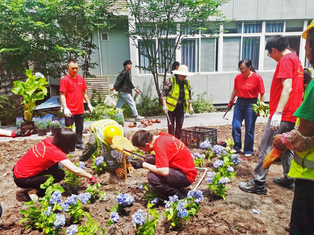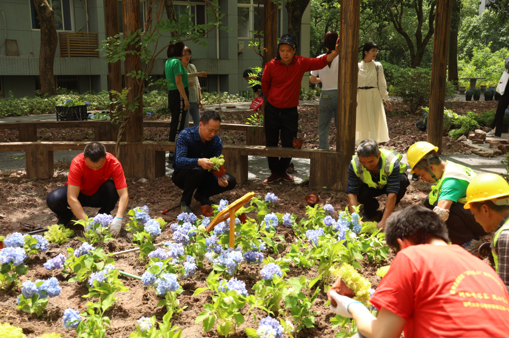 5月20日,心理学部党员师生在专业人员的指导下,根据光照条件、土壤排水性和植物的生长习性,结合视觉审美和文化特色,在共建示范区内精心设计、团结协作,种下绣球、栀子、佛甲草、六月雪、金边吊兰、洒金珊瑚等十余种共计1382株植物。经过劳作,整个花园焕然一新,不同种类的绿植竞相开放,为学部增添一抹清新、一片明亮、一个好去处。活动现场呈现出一派欢快的景象,每个人脸上都洋溢着喜悦的笑容。