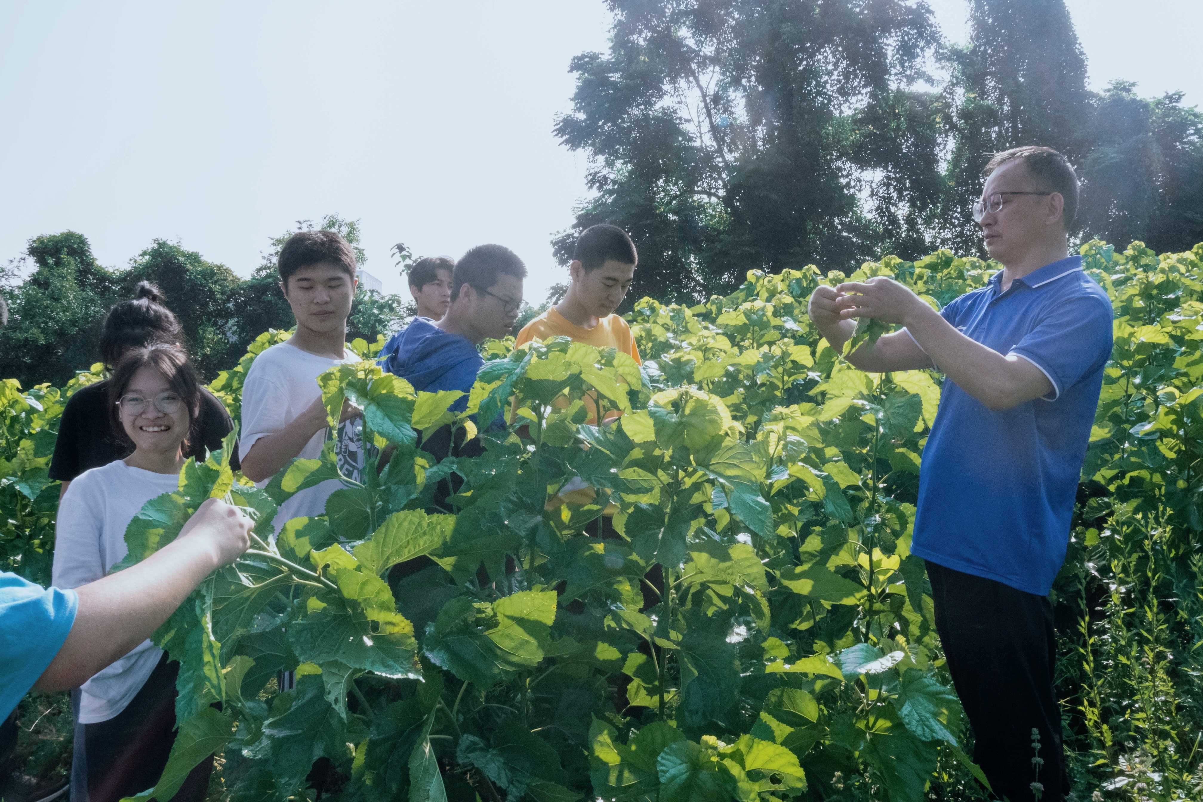 “摘桑叶——通过采摘叶片、保留叶柄、不伤枝皮、保护腋芽的方式来采摘桑叶,将采摘的新鲜桑叶收集好放入口袋中,留待转移至基因库。”随着指导老师敬成俊的细致讲解,学子们按照要求分别为蚁蚕、小蚕和大蚕摘取符合其食用标准的桑叶,同时,修剪枯老桑枝,帮助桑园“获得新生”。