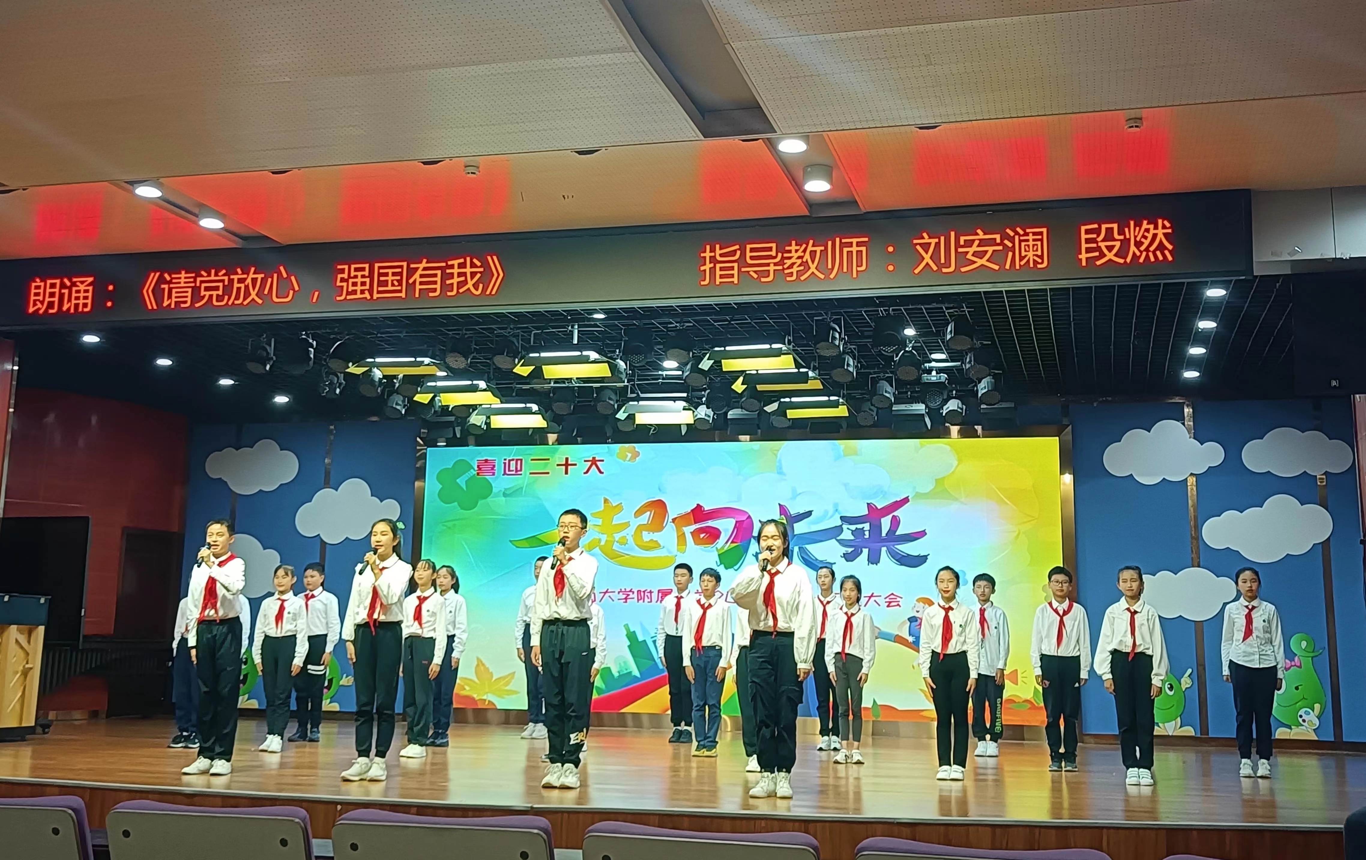 附属小学校长刘才利给孩子们送去节日的祝福,附属小学党委书记张旺宣读本年度的表彰决定。学校绿蕴交响管乐团、附小RCC少年合唱团、舞蹈团、花绳社团、奥尔夫社团、啦啦操队、艺术体操队、街舞社团等社团带来了精彩的表演。五六年级的孩子带来朗诵表演《请党放心强国有我》。
