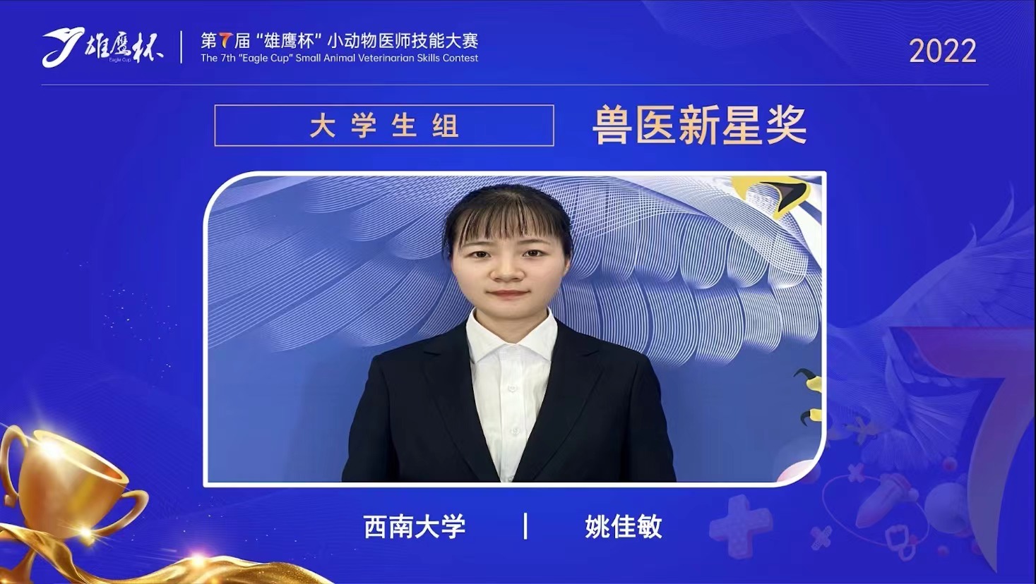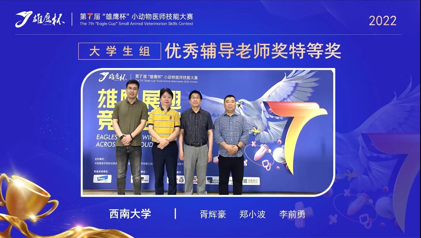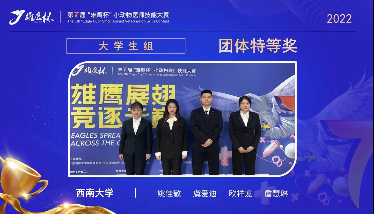 动物医学院姚佳敏、詹慧琳、虞爱迪、欧祥龙4位同学代表学校参赛,取得了在91支高校参赛队伍中总成绩排名第二、各项比赛项目成绩小组第一的成绩。其中,姚佳敏同学获得“兽医新星奖”;动物医学院教师胥辉豪、郑小波、李前勇老师获得“优秀辅导教师特等奖”;