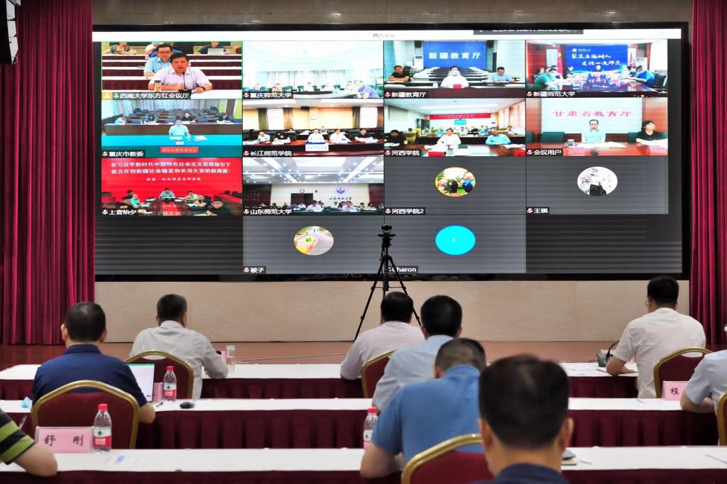 6月13日,学校在东方红会议厅通过线上线下相结合的形式召开教育部师范教育协同提质计划beat365英国官网牵头组团第一次联席工作会议。新疆维吾尔自治区教育厅副厅长童中华、甘肃省教育厅副厅长王光亚、重庆市教委副主任李劲渝,beat365英国官网、新疆师范大学、山东师范大学、和田师范专科学校、河西学院、长江师范学院主要负责同志及相关职能部处等同志等200余人出席了会议。