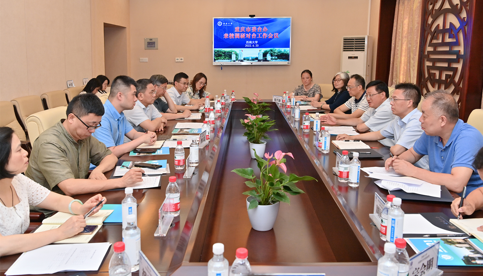 6月20日下午,重庆市委台办主任陈全一行七人来学校调研指导对台教育交流工作,看望在校台湾师生,学校党委书记李旭锋会见陈全一行。副校长陈时见出席调研座谈会,党委统战部、港澳台办公室、人力资源部、学生工作处、招生就业处等相关职能部门,心理学部、外国语学院等相关培养学院负责人、从事对台研究教授、6名台湾师生代表参加调研座谈。
