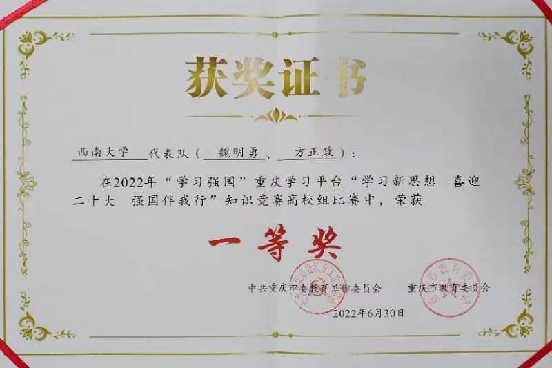 为深入学习贯彻习近平新时代中国特色社会主义思想,营造迎接党的二十大胜利召开的浓厚氛围,6月30日,2022年“学习强国”重庆学习平台“学习新思想 喜迎二十大 强国伴我行”知识竞赛高校组比赛落下帷幕,学校学子表现优异荣获一等奖。