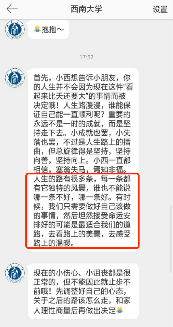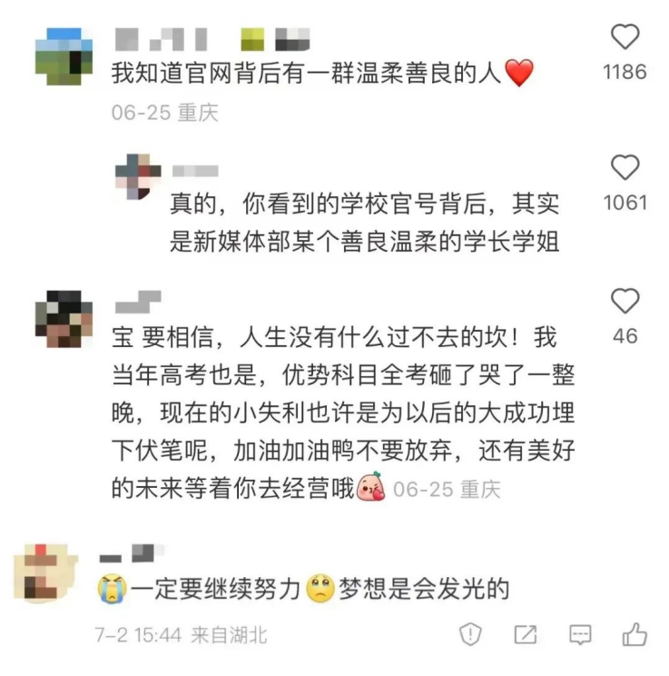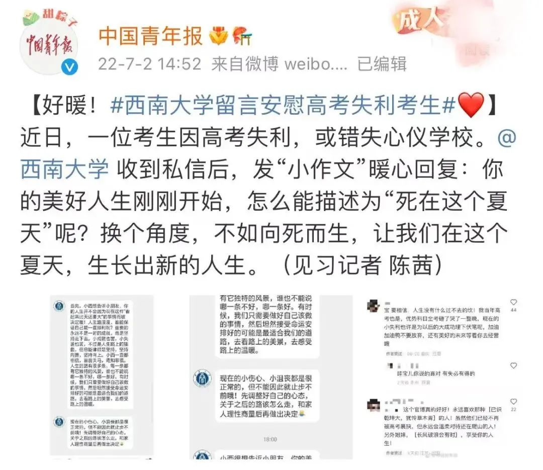 7月2日,一条主题为“beat365英国官网留言安慰高考失利考生”的微博引发了网友的关注,一名重庆考生高考失利,感受到巨大的心理落差后给学校官方微博留言,随即留言得到了微博运营团队同学的暖心回复,温暖的故事受到了人民日报、新华社、光明日报、央视新闻、中国青年报等媒体的广泛关注与报道,内容如下: