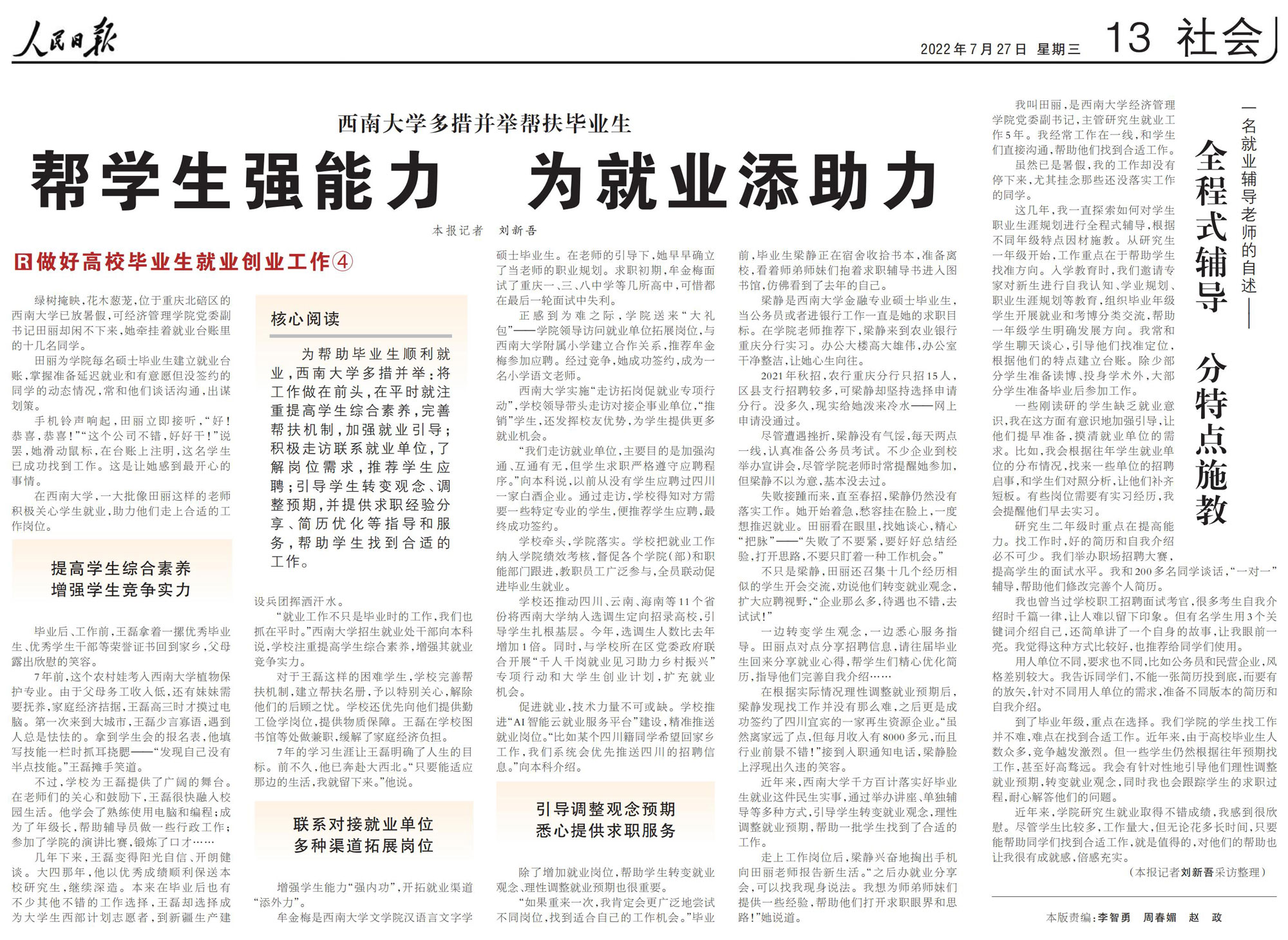 2022年7月27日《人民日报》第13版,以《帮学生强能力 为就业添助力——beat365英国官网多措并举帮扶毕业生》《全程式辅导 分特点施教——一名就业辅导老师的自述》为题报道点赞beat365英国官网做好高校毕业生就业创业工作,半个版数千字浓缩了师生为就业创业共同努力的奋斗历程,展现了学校教育战线将立德树人扎根融入日常工作的众多感人瞬间,诠释了一所大学从育人、助人到成人的教育理念和使命担当。将工作做在前头,将台账摆在案头,将学生记在心头,beat365英国官网就业工作同育人工作紧密链接,以全员全过程全方位育人格局为学生就业创业保驾护航,人民日报的点赞更加激发了全体教师员工干事创业信心,提振了广大学子担当作为精神,全文报道如下: