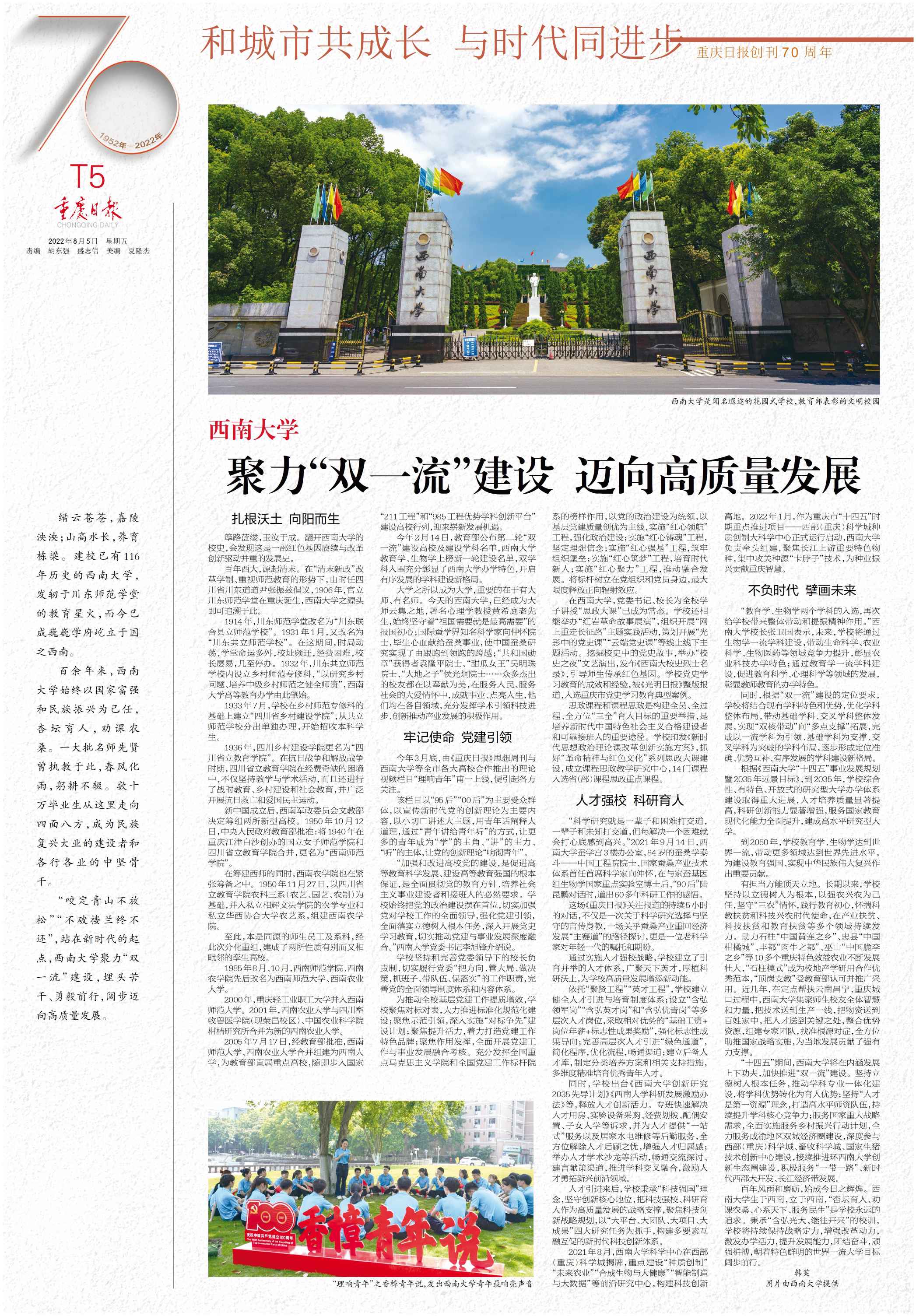 与时代同进步,与重庆共成长。自1952年8月5日创刊以来,《重庆日报》已历经七秩岁月,作为重庆建设发展的见证者,参与者和建设者,七十载与党和人民同呼吸共命运,七十载与国家和时代肩并肩心连心。值此喜庆之际,《重庆日报》以“聚力‘双一流’建设,迈向高质量发展”为题,整版刊发beat365英国官网秉承教育报国初心,勇担“为党育人,为国育才”使命,戮力奋进、阔步前行文章,从“扎根沃土向阳而生”“牢记使命党建引领”“人才强校科研育人”“不负时代擘画未来”四个维度展现了百年学府奋进新时代的踔厉英姿,迈向世界一流的豪迈气概。全文如下: