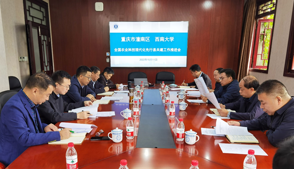 为扎实推进全国农业科技现代化先行县共建工作,10月11日,潼南区区委副书记、区委农业农村工委书记、国家农业科技园区工委书记杨宏,区人民政府副区长罗全良来校参加共建工作推进会,学校副校长赵国华出席会议。