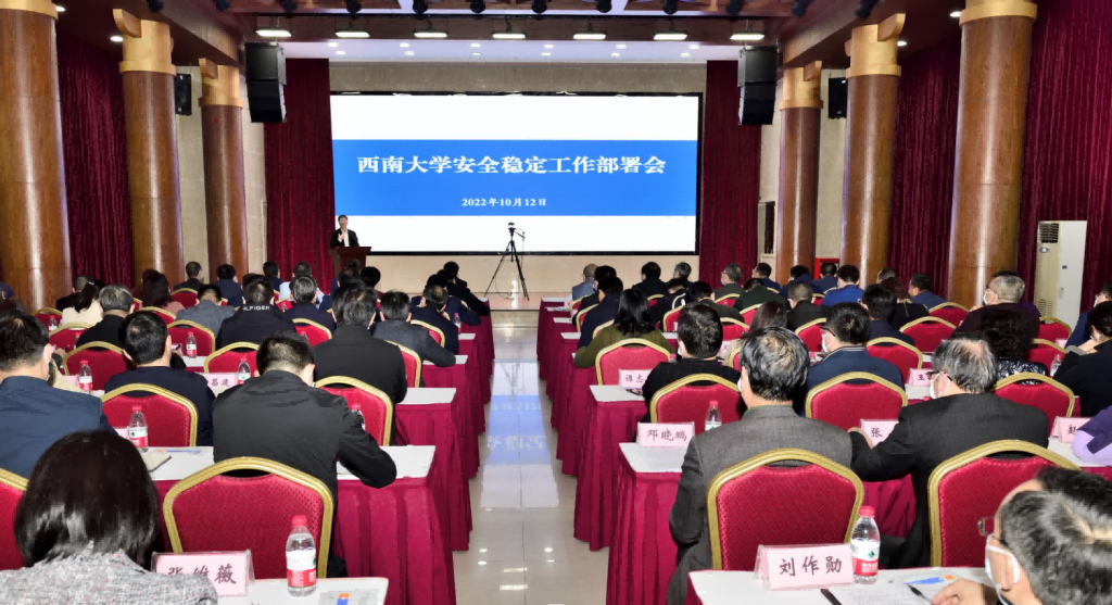 为全力做好学校安全稳定各项工作,营造良好校园氛围和稳定环境,10月12日,学校在东方红会议厅召开安全稳定工作部署会。学校党委书记李旭锋,校长张卫国,党委副书记安春元、潘洵,副校长韩旭东出席会议,安全稳定工作领导小组成员单位主要负责人、二级党组织书记参加会议。会议由张卫国主持。