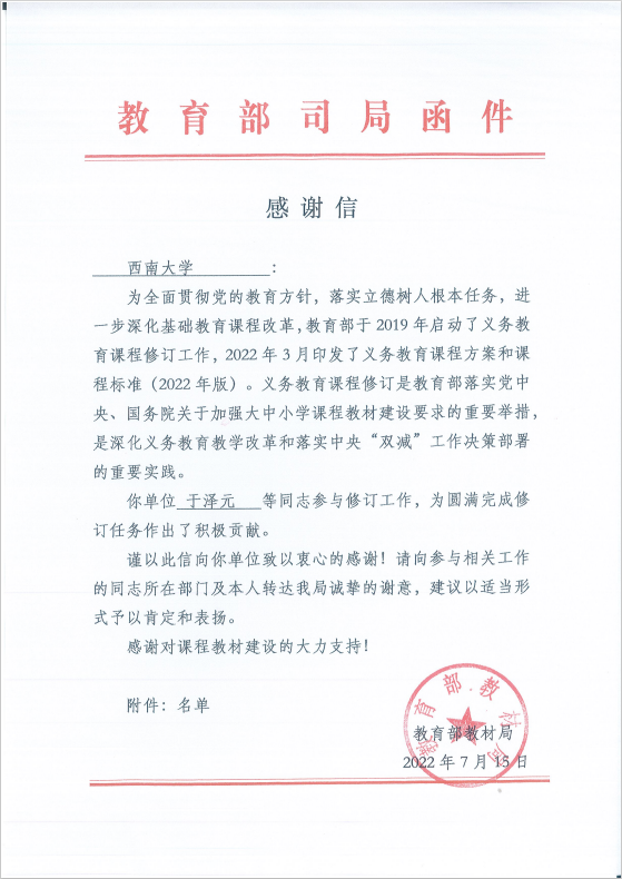 近日,教育部教材局向学校发来感谢信,对学校教师教育学院教师于泽元、任明满、张廷艳、荣维东、廖伯琴,体育学院教师彭莉,出版社蒋敏洁在义务教育课程修订期间参与修订、圆满完成修订任务表示衷心感谢。