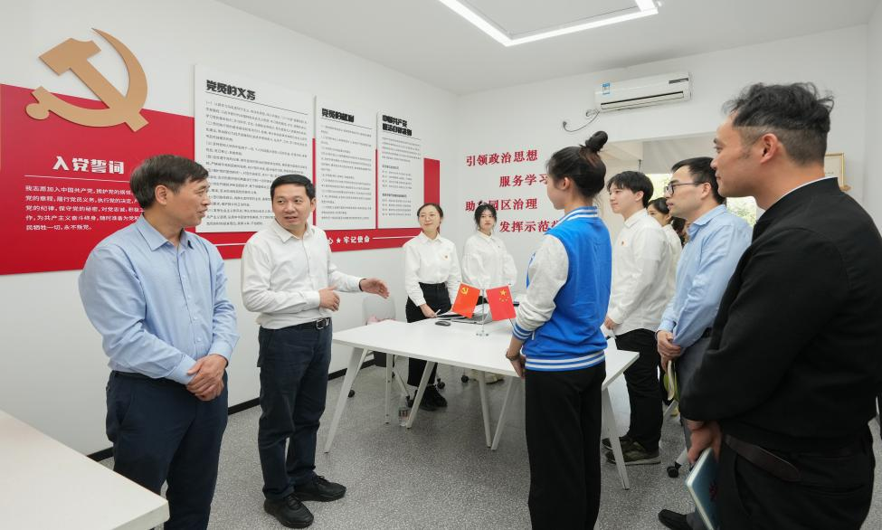 随后,廖传锦一行观摩了青马剧社排演的《红色特工张露萍》情景剧、学生宣讲团“学习党的二十大报告”主题快板,参观了学校学生园区综合育人服务平台“青竹空间”,现场指导学生会特设党支部、“西小兰”志愿服务站、青年创新创业中心、研究生支教团工作。