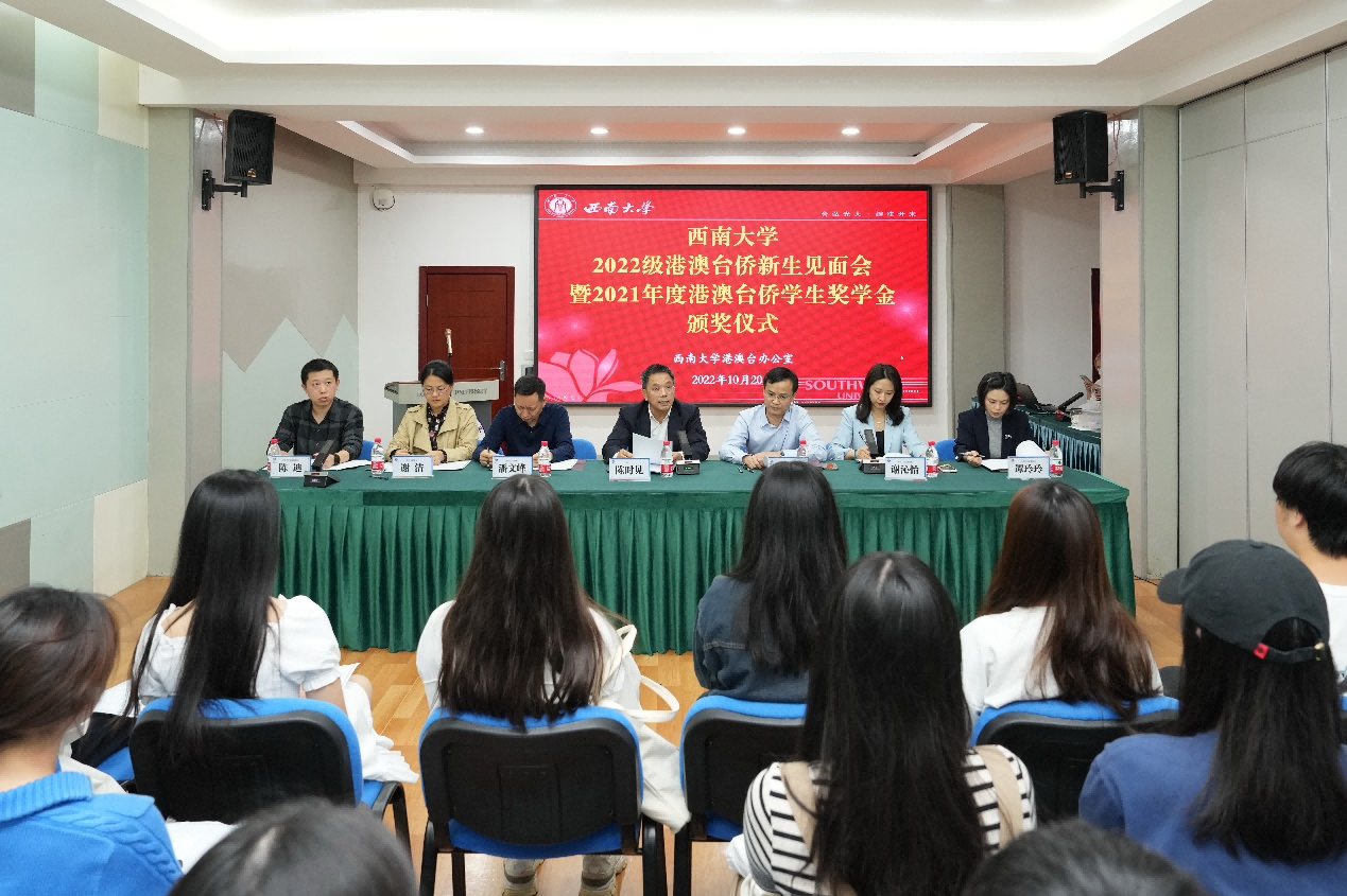 为帮助学校港澳台侨新生尽快完成角色转换,适应大学校园的学习生活,引导港澳台侨新生“扣好人生第一粒扣子”,10月20日下午,2022级港澳台侨新生见面会暨2021年度港澳台侨学生奖学金颁奖仪式在港澳台办公室举行。副校长陈时见出席会议,港澳台办公室、教务处、学生工作处、招生就业处、团委、保卫处等相关职能部门负责人,2021年度港澳台侨学生奖学金获得者及全体港澳台侨新生参加会议。